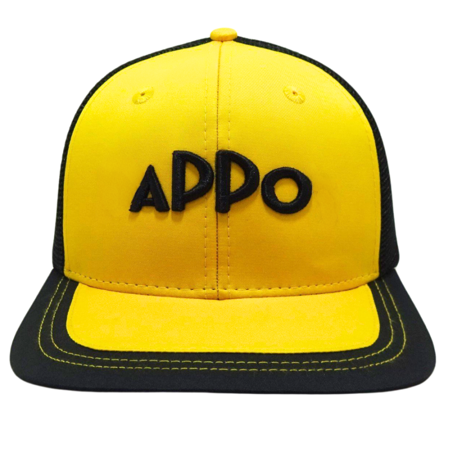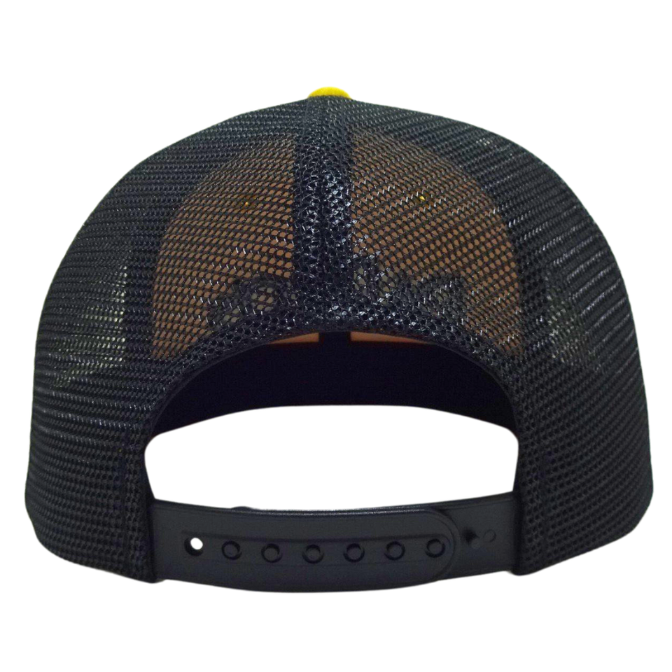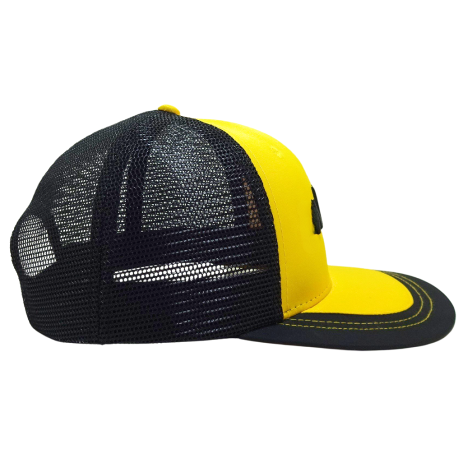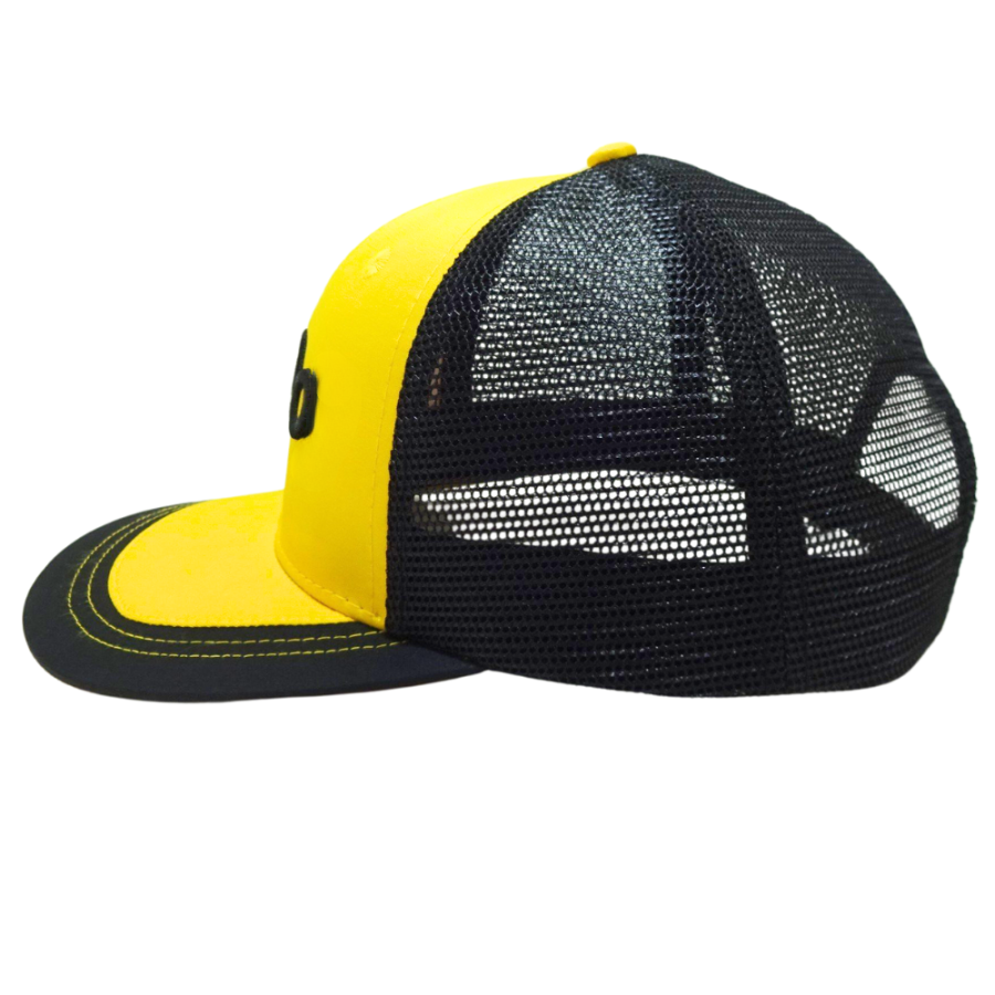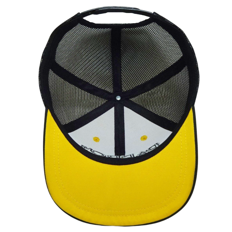 6แผงหมวกทรูเกอร์แบบสั่งทำ3D โลโก้แบบมีขอบแบนสีดำและสีเหลืองแบบตาข่ายเย็บสีตัดกันหัวเข็มขัดกระดุมแถวเดียวทำจากพลาสติก