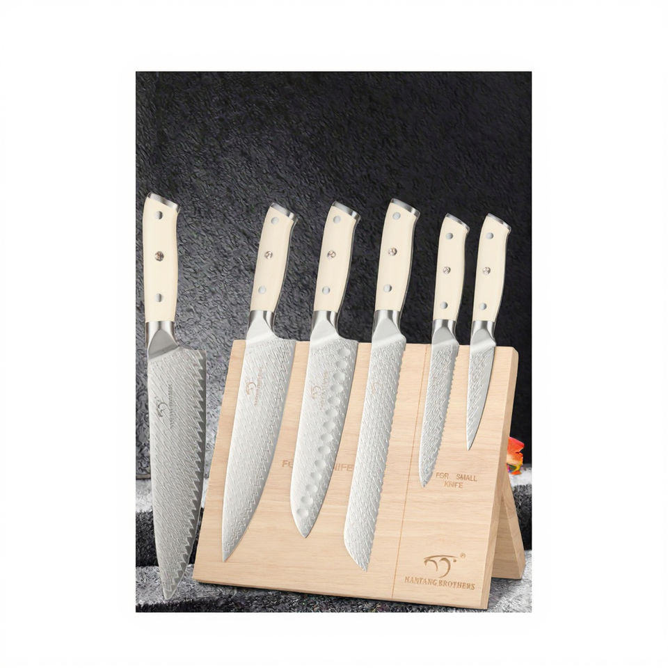 ชุดมีดทำครัวเชฟเหล็กดามัสกัส 6 ชิ้น 67 ชั้น ผลิตด้วยมือ พร้อมด้ามจับพลาสติกแบบใช้ได้ทั้งสองมือ และแท่นวางไม้