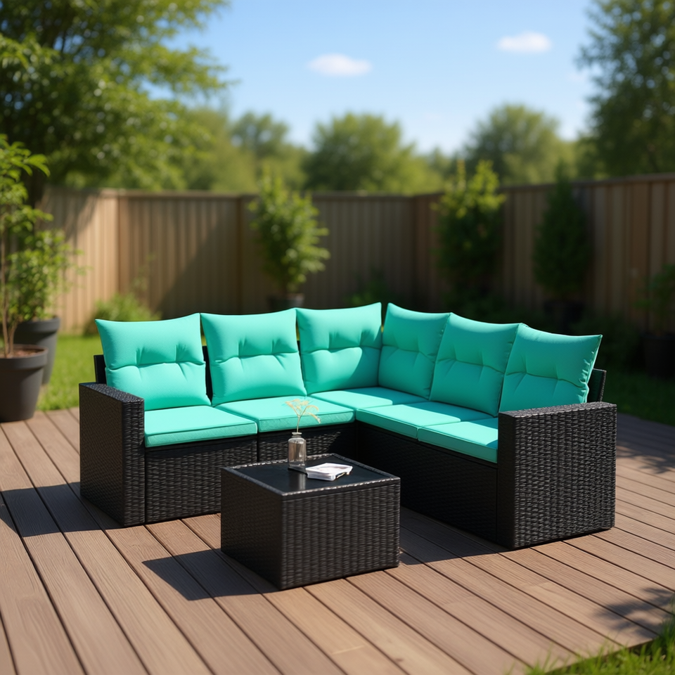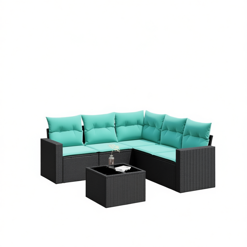 ชุดโซฟาลานบ้านหวายโพลีสีดำ 6 ชิ้นพร้อมเบาะรองนั่ง เฟอร์นิเจอร์กลางแจ้งสำหรับ 6 คน ดีไซน์ร่วมสมัย สไตล์โมเดิร์น