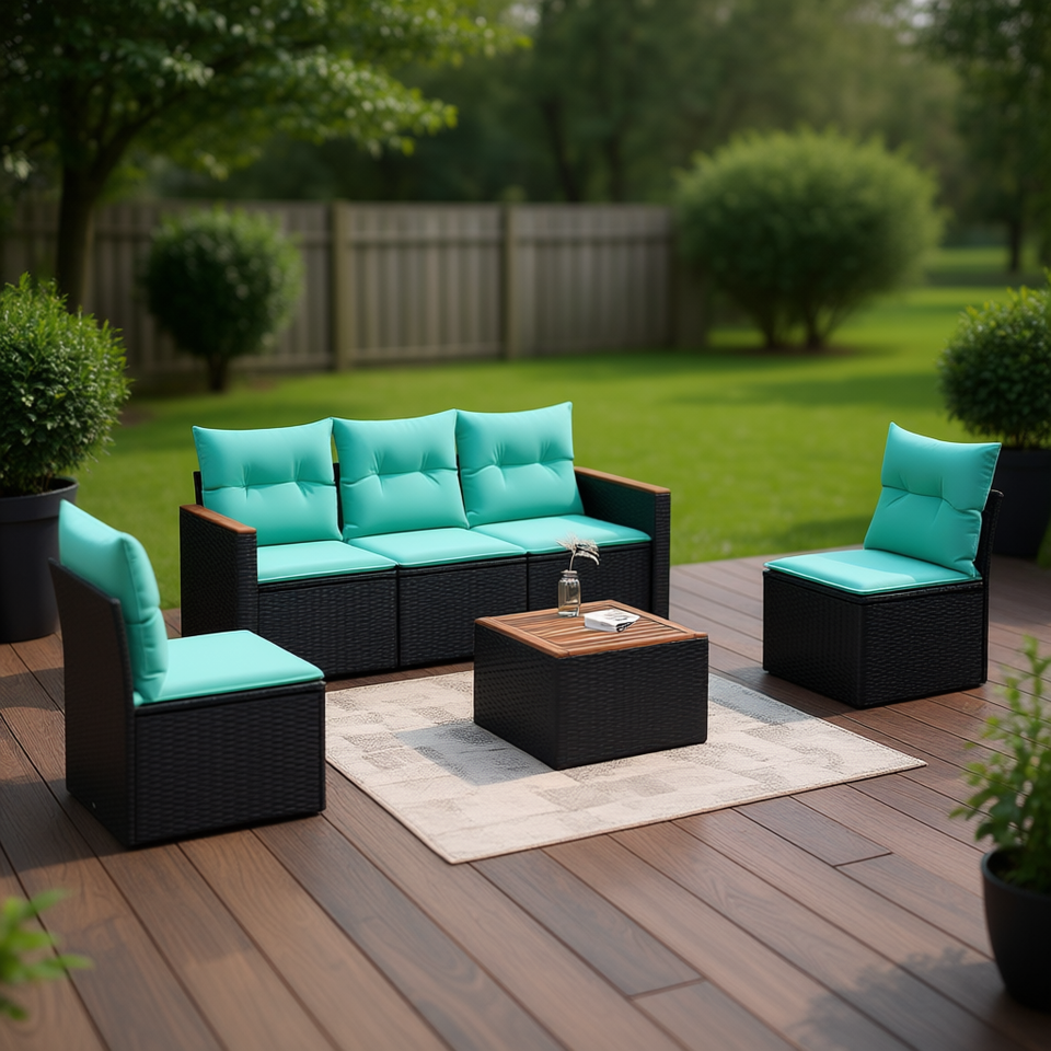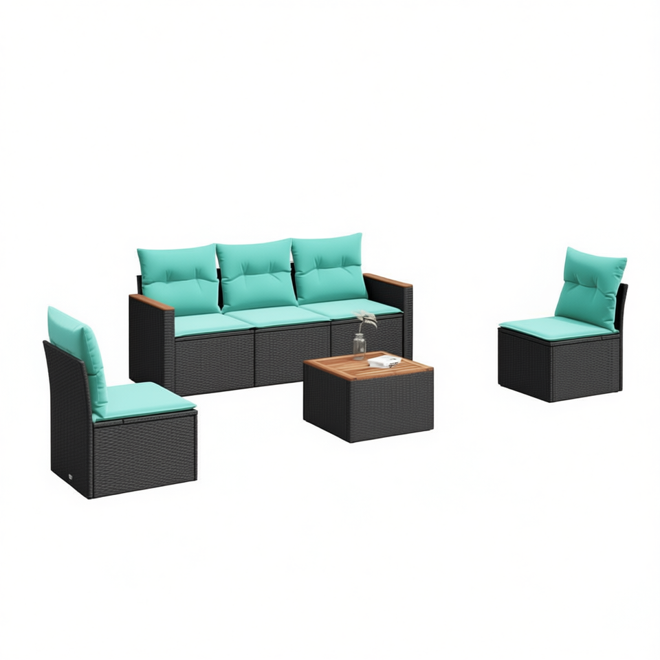 ชุดโซฟาหวายสังเคราะห์สีดำพร้อมเบาะรองนั่ง เฟอร์นิเจอร์กลางแจ้งสำหรับ 6 ที่นั่ง ดีไซน์ร่วมสมัย สไตล์โมเดิร์น