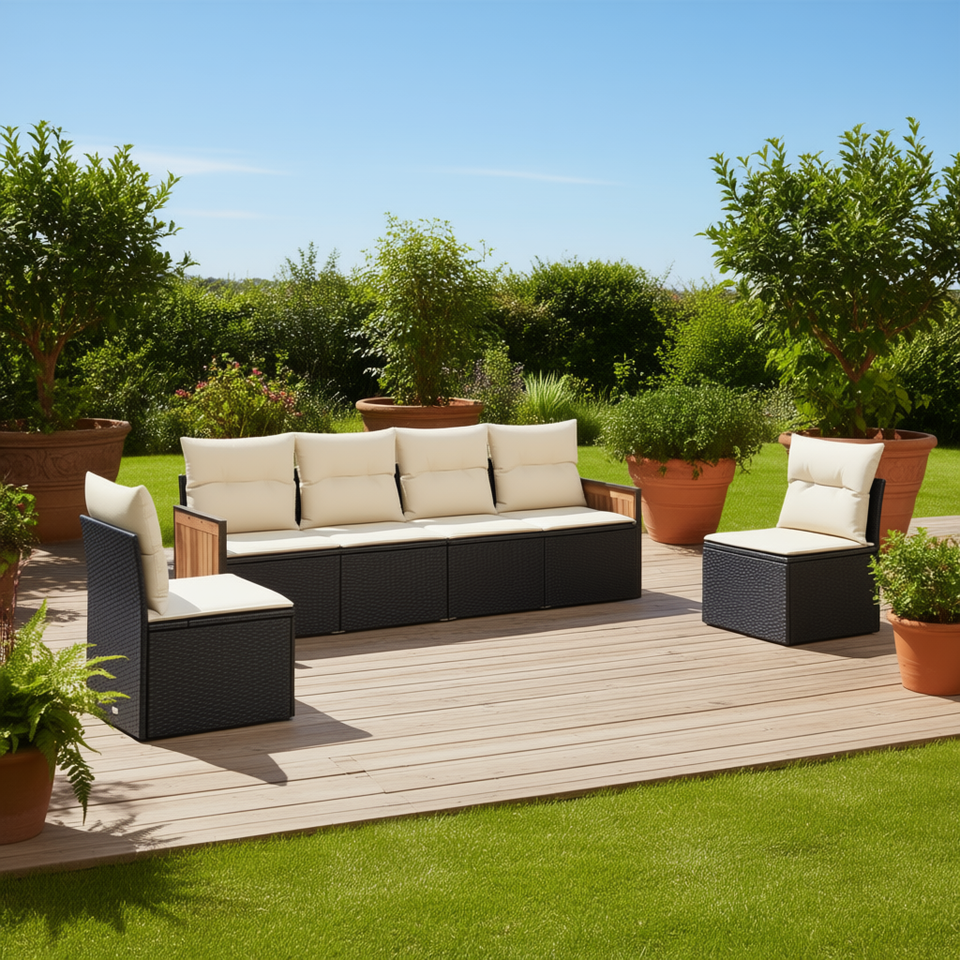ชุดโซฟาสวนหวายสังเคราะห์สีดำ เฟอร์นิเจอร์กลางแจ้ง ดีไซน์ทันสมัย ทนทาน พร้อมเบาะโฟมความหนาแน่นสูง