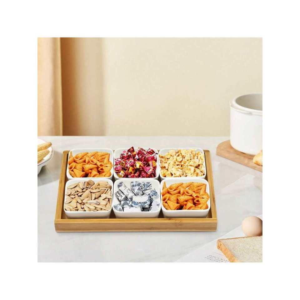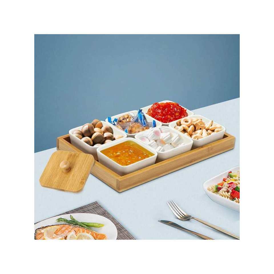 6-Piece Large Steel Ceramic Snack Serving Tray with Bamboo Lids Removable Compartment Bowls and Serving Platter Pallets