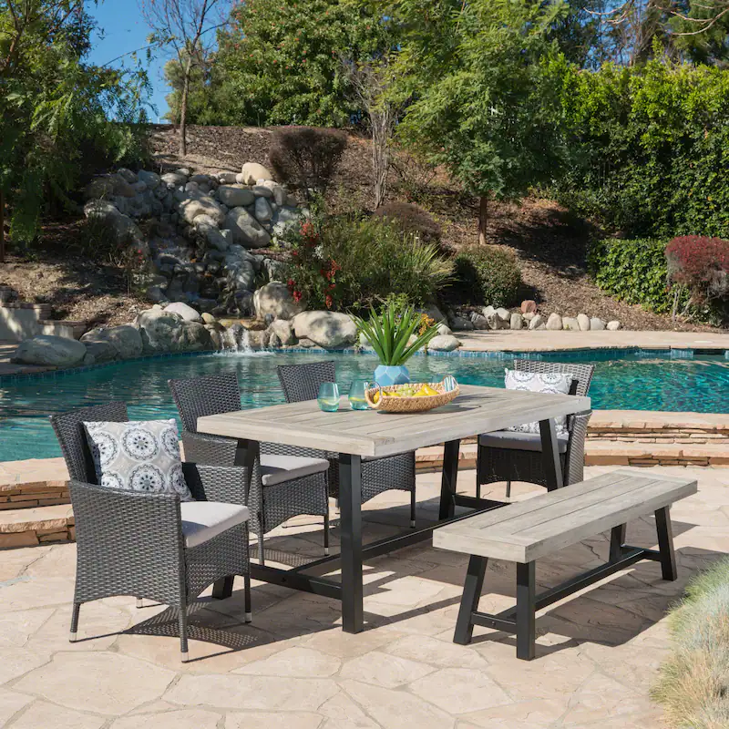 ชุดรับประทานอาหารไม้สัก6ชิ้นสำหรับลานบ้านทำจากไม้สักกลางแจ้งทนทานต่อสภาพอากาศเฟอร์นิเจอร์ม้านั่งสบายเป็นมิตรกับสิ่งแวดล้อม