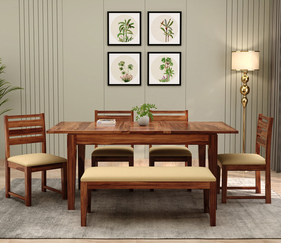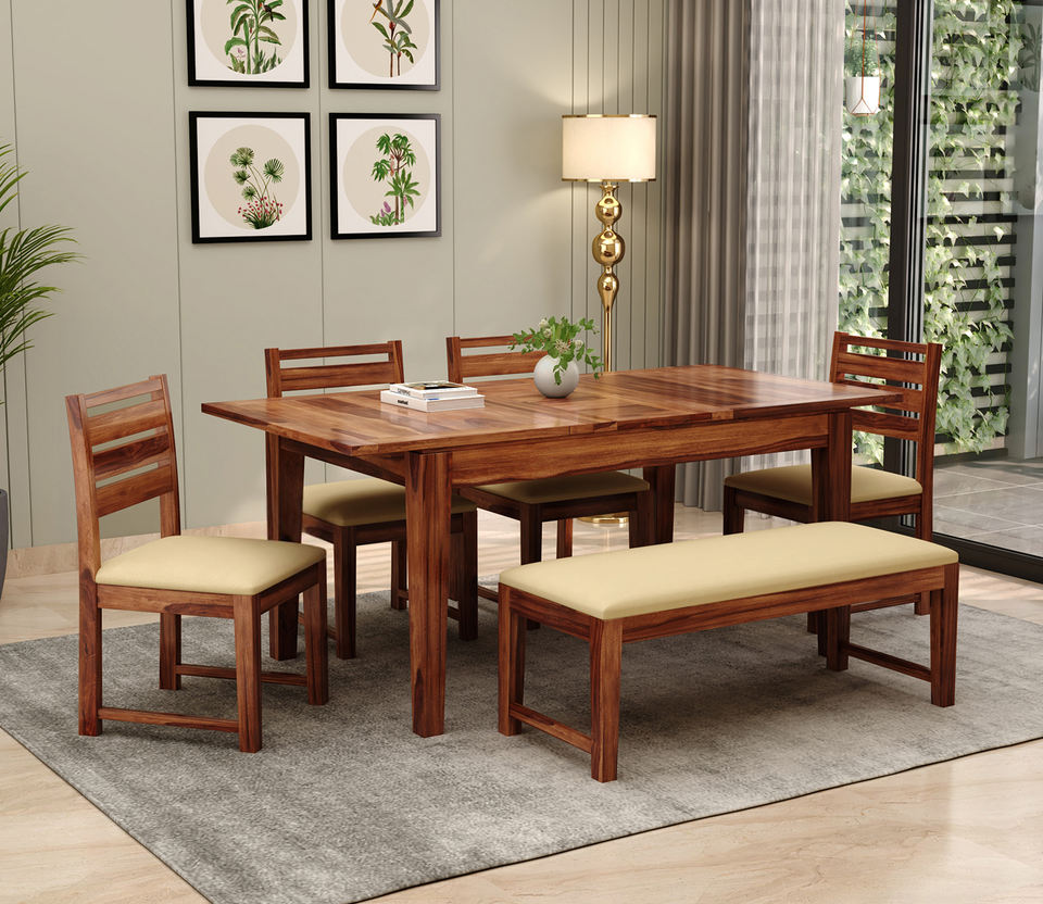 ชุดโต๊ะอาหารไม้ชีแชมแบบขยายได้ 6 ที่นั่ง พร้อมเก้าอี้หุ้มเบาะสีน้ำผึ้ง 4 ตัว และม้านั่ง ชุดโต๊ะครัว 6 ชิ้น