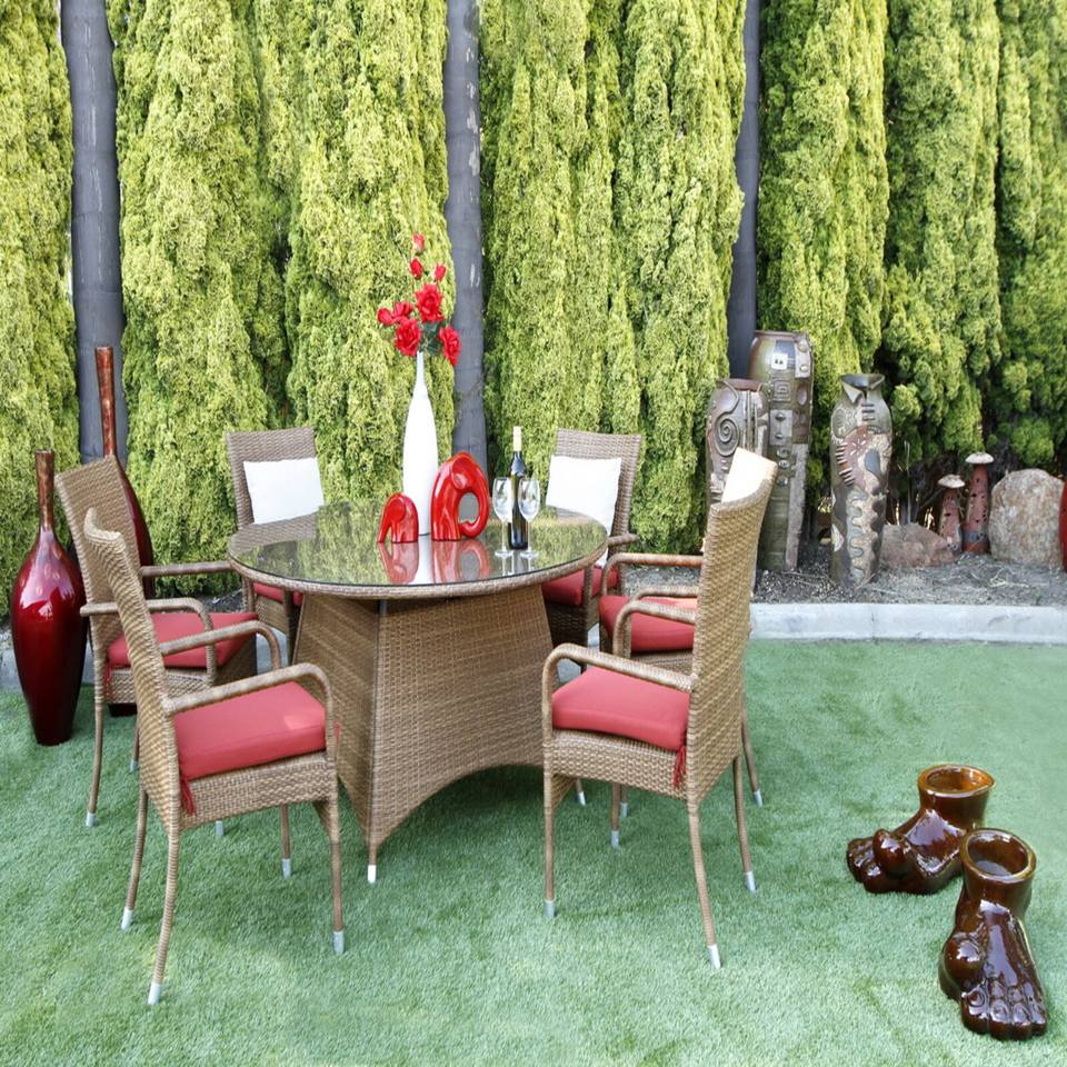 ชุดรับประทานอาหารกลางแจ้ง6ที่นั่งพร้อมเบาะรองนั่งเก้าอี้หวายและโต๊ะกระจกสำหรับโรงแรมและสวนสาธารณะ