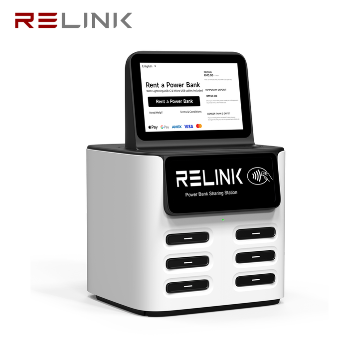 เครื่องให้เช่าแบตสำรองมือถือ 6 ช่อง พร้อมระบบ POS ติดตั้งง่าย รองรับการชาร์จเร็ว PD & Qi แบตสำรองสำหรับเช่า ชาร์จโทรศัพท์