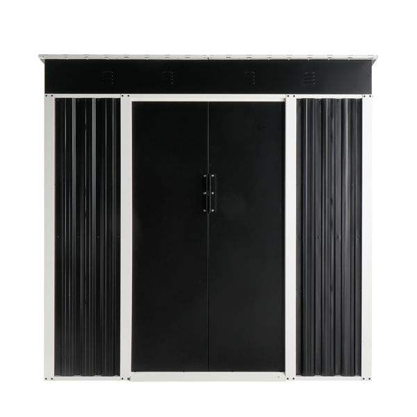 โรงเก็บของในสวนโลหะสีดำ6x4ฟุตโรงเก็บของพร้อมหลังคาเอียงและประตูบานเลื่อนสองชั้นสำหรับสนามหลังบ้านกลางแจ้ง