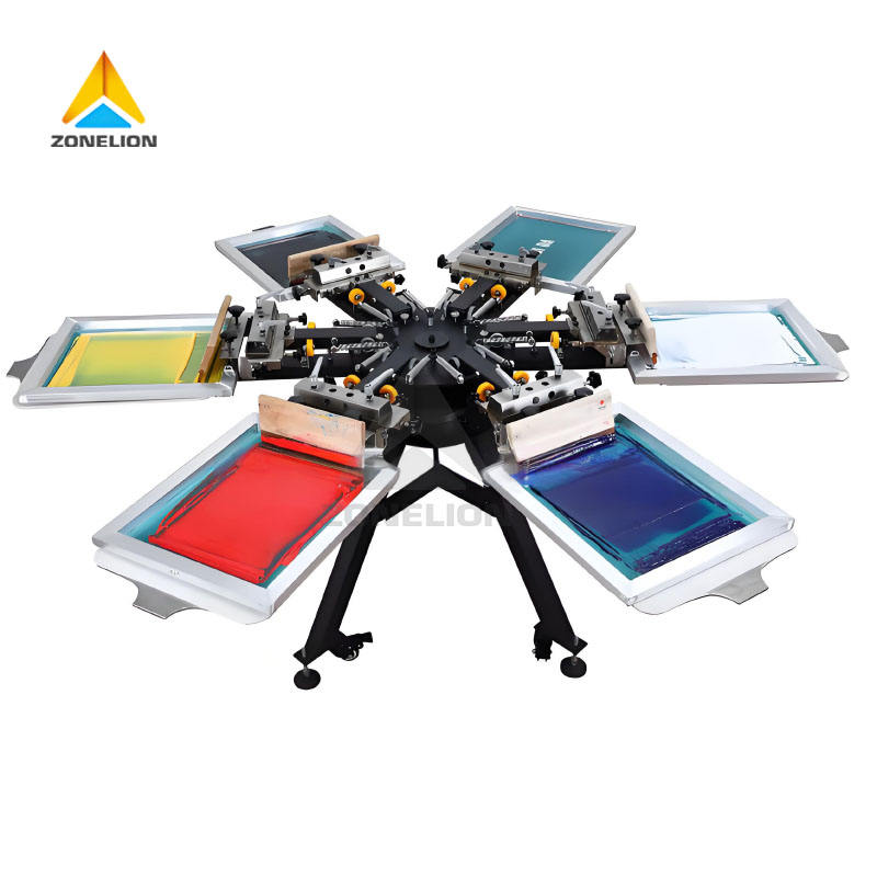 เครื่องพิมพ์สกรีน 6 สี สำหรับงานเวิร์คสเตชั่น ปรับแต่งเสื้อผ้า ผ้า ทีเชิ้ต ได้อย่างแม่นยำ พร้อมโต๊ะอะลูมิเนียม เครื่องพิมพ์หลายสี