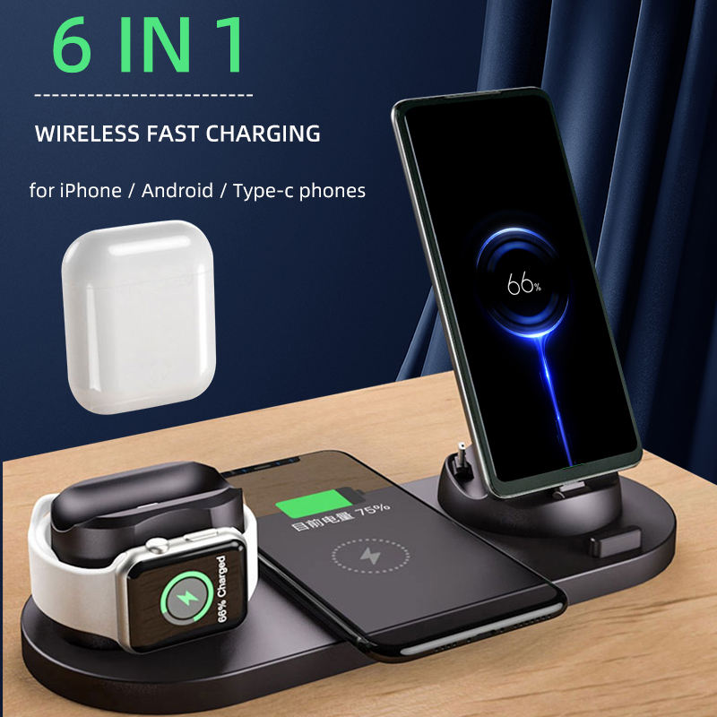 แท่นชาร์จ 6 in 1:ชาร์จสำหรับสมาร์ทวอทช์, หูฟัง, iPhone, Android, โทรศัพท์ Type-C