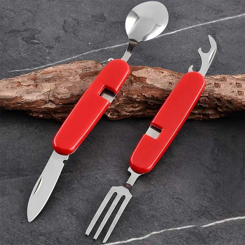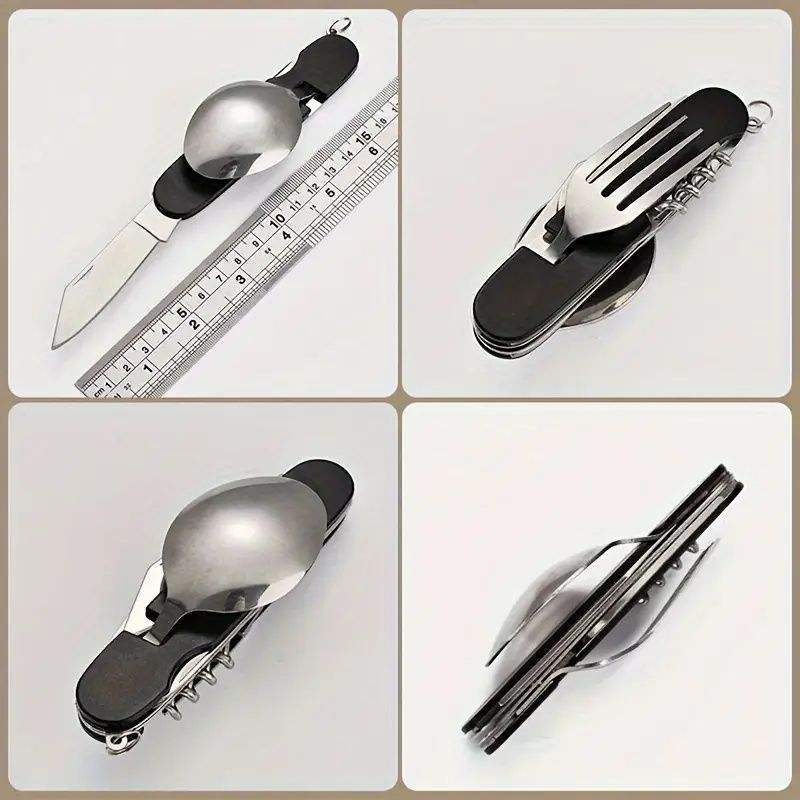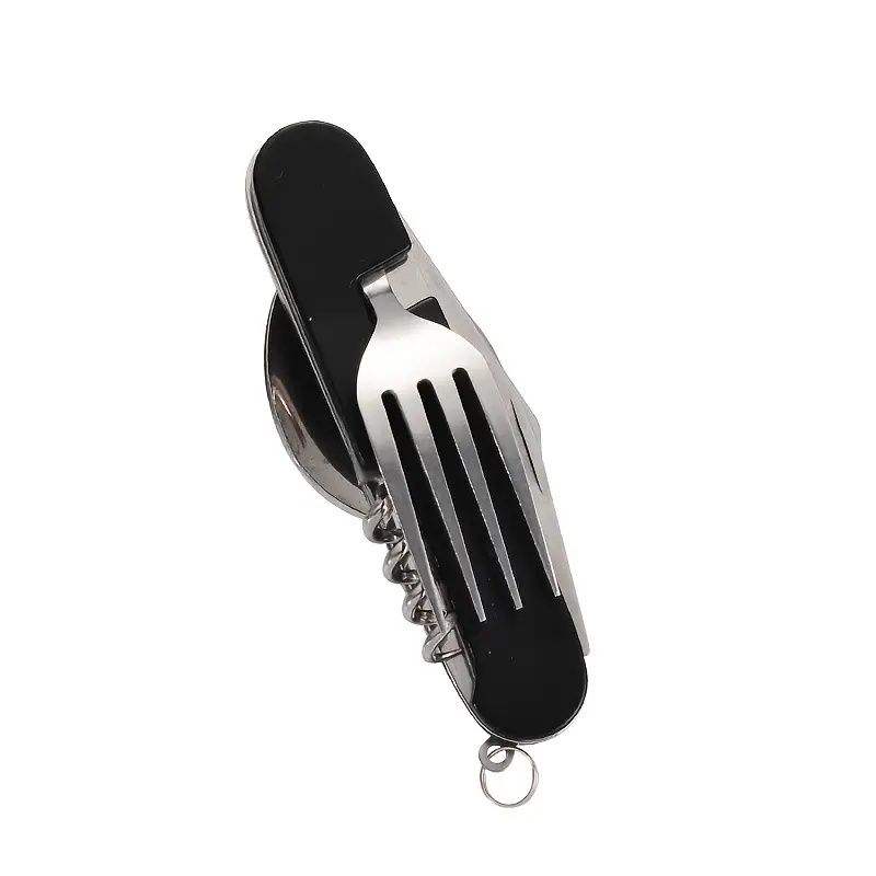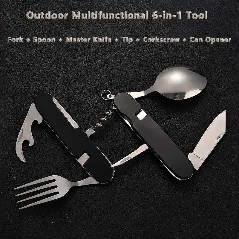 ชุดอุปกรณ์อเนกประสงค์สแตนเลส 6-in-1 มีดพับ ส้อม ช้อน ที่เปิดกระป๋อง ที่เปิดขวดไวน์ ที่เปิดขวดน้ำ สำหรับการตั้งแคมป์