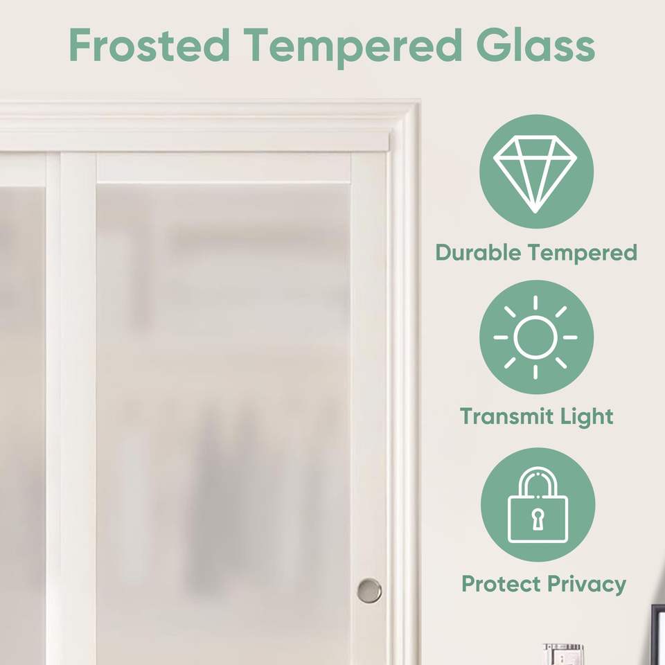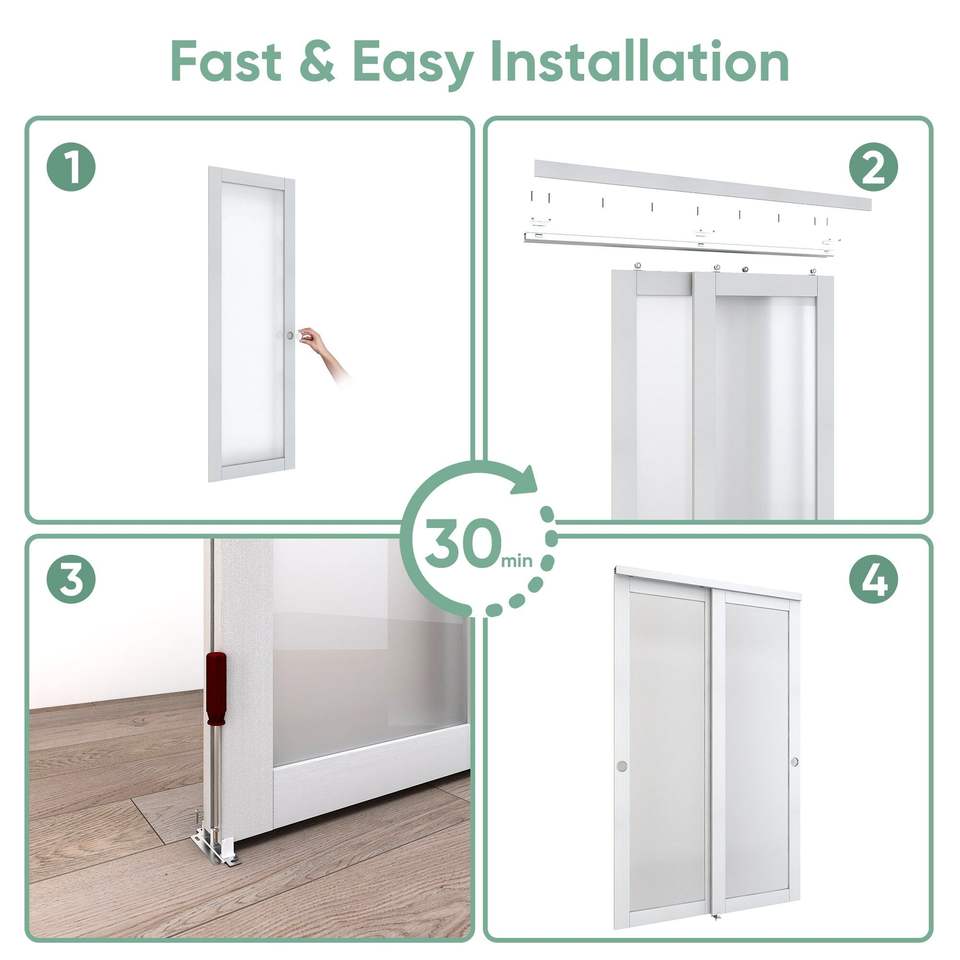 ประตูตู้เสื้อผ้าบานเลื่อนคู่แบบไม้ กระจกนิรภัยฝ้า 1 ชั้น ขนาด 60 นิ้ว x 80 นิ้ว พร้อมชุดอุปกรณ์ติดตั้ง