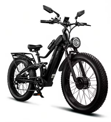 จักรยานไฟฟ้ามอเตอร์คู่ 6000W/5000W สำหรับผู้ใหญ่ ความเร็ว 52 ไมล์ต่อชั่วโมง พร้อมแบตเตอรี่ 60V32A, ยางขนาด 26x4 นิ้ว สำหรับทุกสภาพพื้นผิว, ระบบกันสะเทือนเต็มรูปแบบ, SHM