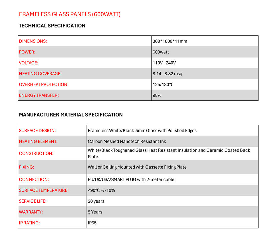 ชื่อผลิตภัณฑ์:แผงความร้อนอินฟราเรดไร้กรอบ600วัตต์