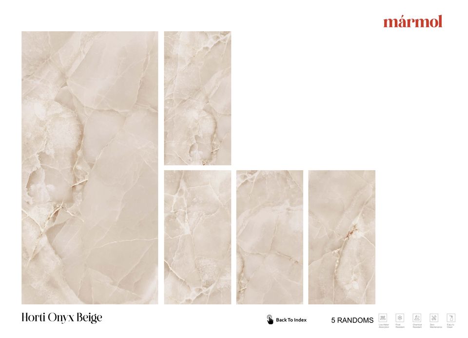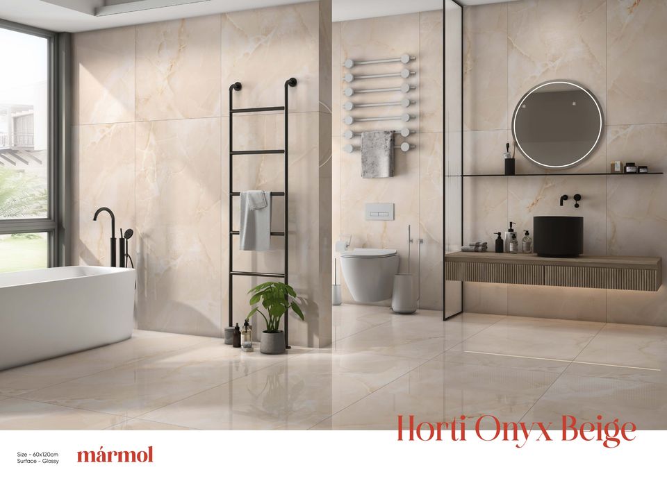 กระเบื้องพอร์ซเลนเคลือบเงา ดีไซน์ยุโรปสมัยใหม่ ขนาด 600x1200 มม. รุ่น HORTI ONYX BEIGE กันลื่น ป้องกันแบคทีเรีย เหมาะสำหรับห้องน้ำและห้องต่างๆ ในบ้าน ผิวเงา