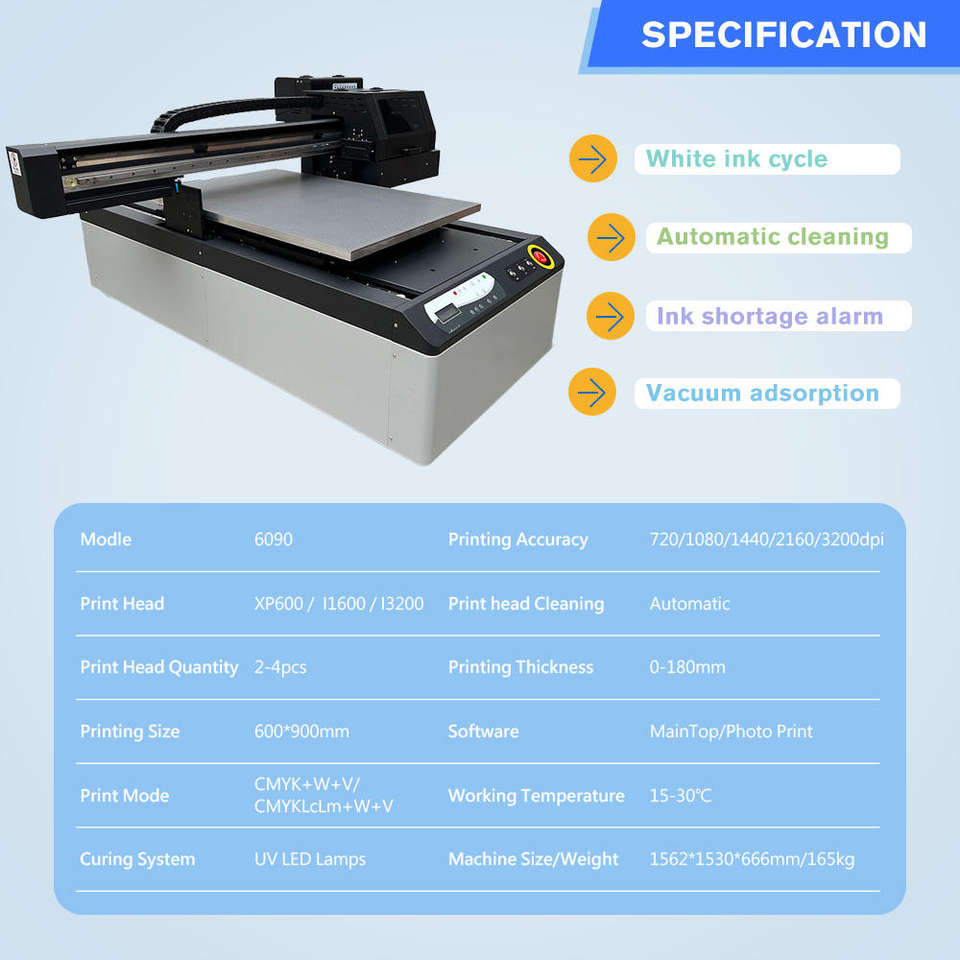 เครื่องพิมพ์ยูวีแบบตั้งโต๊ะขนาด 6090 60 x 90 ซม. แบบพกพา หัวพิมพ์คู่ I3200 รุ่น 6090 UV Flatbed พร้อมสี CMYK สีขาว และวานิช