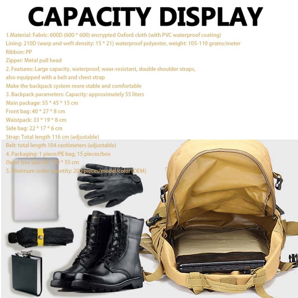 กระเป๋าเป้สะพายหลังแบบยุทธวิธีขนาด 60 ลิตร รุ่น Fieldline Molle ทำจากโพลีเอสเตอร์ พร้อมกระเป๋าถอดออกได้ 3 ใบ
