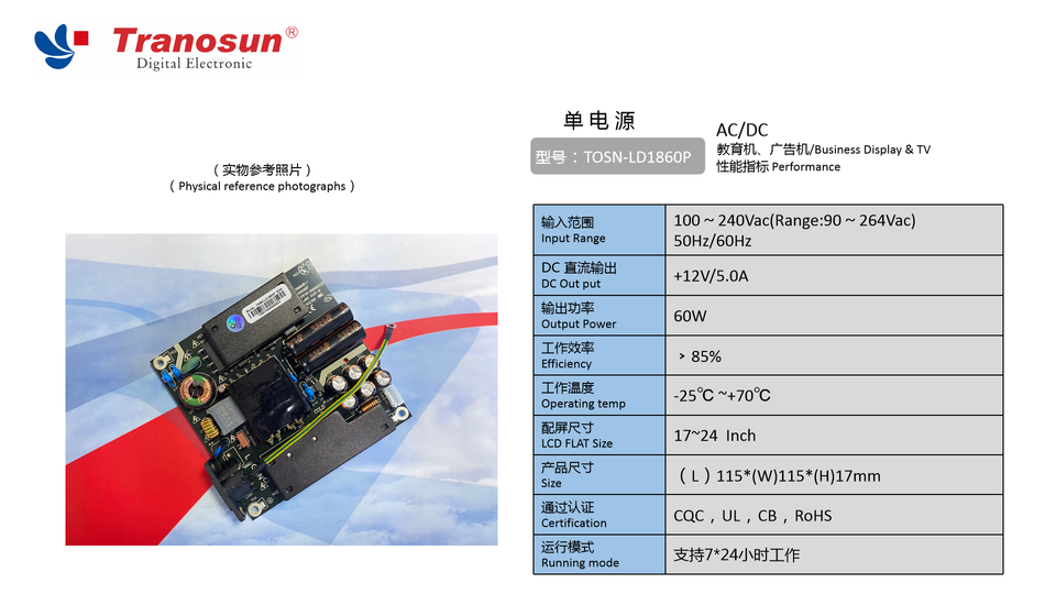 แหล่งจ่ายไฟสำหรับจอมอนิเตอร์อีสปอร์ต60วัตต์พร้อม12โวลต์/5.0A เอาต์พุต LD1860P