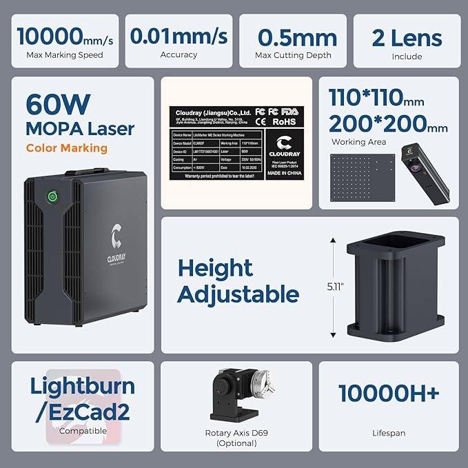 เครื่องแกะสลักไฟเบอร์เลเซอร์ MOPA 60W, ทำเครื่องหมายสี, แกะสลักโลหะด้วยเลนส์ F-Theta 2 ตัว, 110x110 มม., เครื่องแกะสลักด้วยเลเซอร์