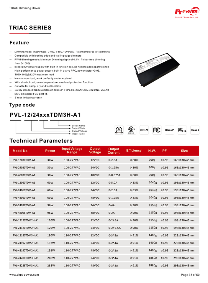 ประเภท:ไดร์เวอร์ LED หรี่แสงได้ Triac แรงดันคงที่