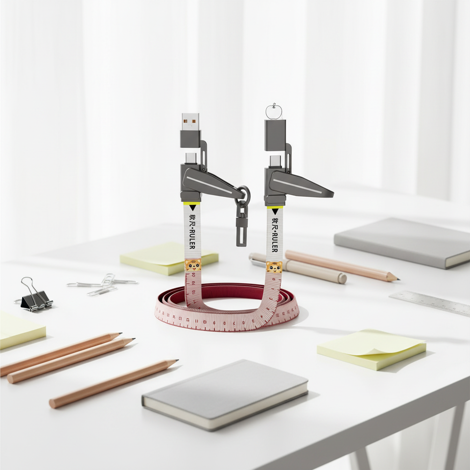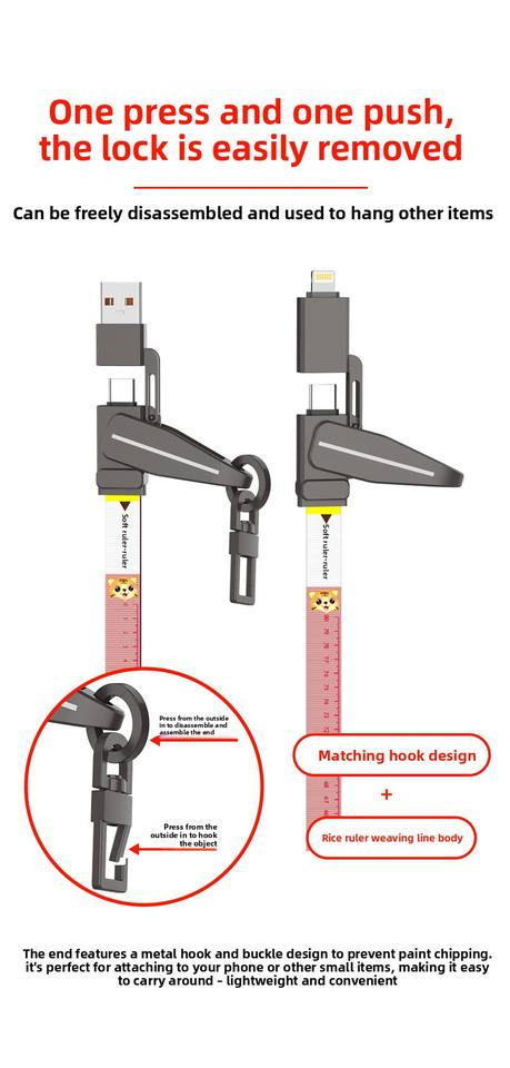 60W USB-C Cable Phone Neck Strap Lanyard Fast Charging & Multi-Function Ruler Design Durable 4in1 Cable 120CM for Smartphones