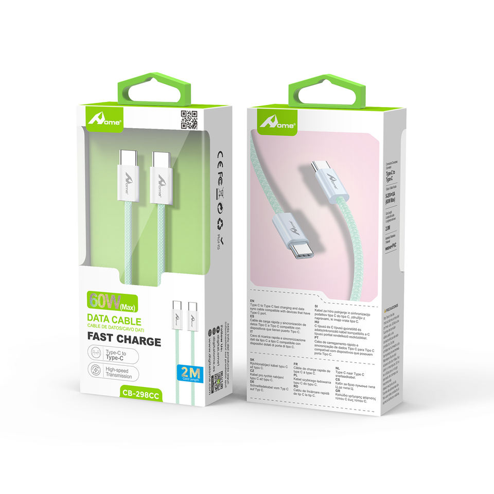 60W USB Tipo C TO Tipo C 2M CB-298CC สีเขียวชาร์จเร็ว6A 60W 3A สายทองแดงบริสุทธิ์และอลูมิเนียมผสม2M