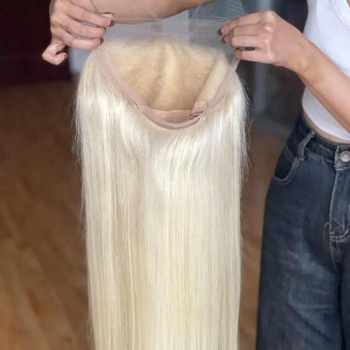 วิกผมตรงสีแพลตตินัม 613 แบบเต็มศีรษะ ทำจากผมแท้บริสุทธิ์ วิกผมสีบลอนด์ขาว วิกผมลูกไม้ด้านหน้าสำหรับผู้หญิง