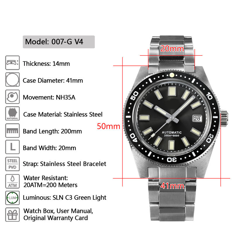 ลักษณะ:ประดาน้ำ, พลังงานสำรอง, เรืองแสง, มือส่องสว่าง, ป้องกันแม่เหล็ก, ช็อตทน