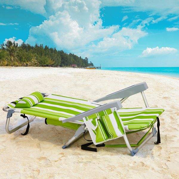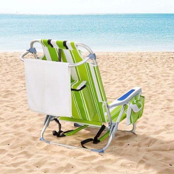 เก้าอี้ชายหาดลายทางสีเขียว ขนาด 63*65*82 ซม. ทำจากผ้าอ๊อกซ์ฟอร์ดสีเงินขาว โครงอะลูมิเนียม รับน้ำหนักได้ 100 กก.