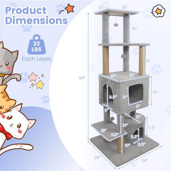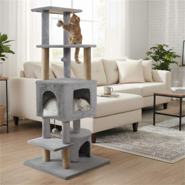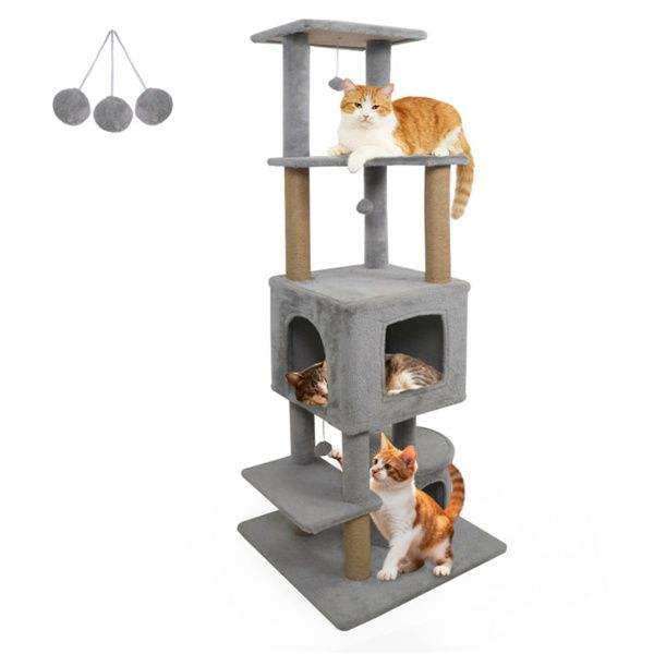 คอนโดแมวสีเทาอ่อนขนาด 64 นิ้ว พร้อมที่นอนนุ่มๆ 3 จุด ลูกบอลห้อย 3 ลูก เสาข่วนทำจากปอกระเจา พร้อมอุปกรณ์ป้องกันการล้ม สำหรับบ้านที่มีแมวหลายตัว