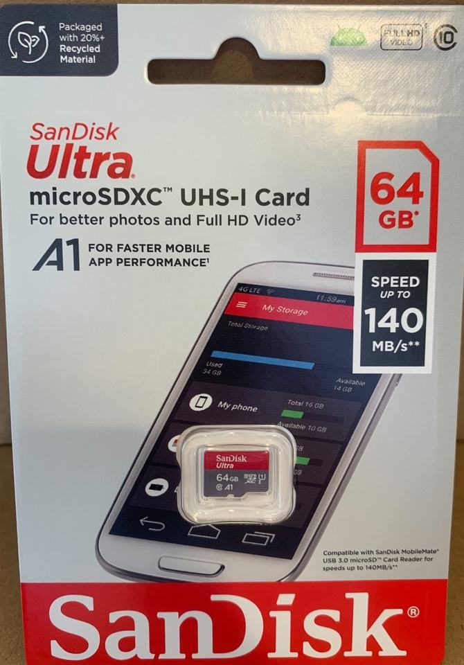 การ์ดหน่วยความจำ64GB 140เมกะไบต์/วินาที, C10, U1, Full HD, A1, SDSQUAB-064G-GN6MN เฉียบ