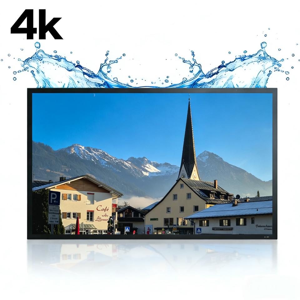 ทีวีกลางแจ้งขนาด 65 นิ้ว กันฝุ่นและกันน้ำ IP55 ติดผนัง ความสว่าง 2000 นิต สำหรับร้านอาหารกลางแจ้งริมสระน้ำ