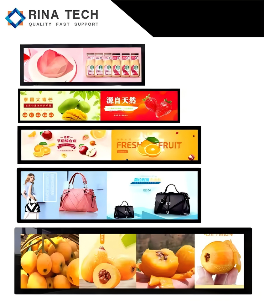 หน้าจอแสดงผลดิจิทัลแบบติดตั้งบนชั้นวางสินค้าขนาด 65 นิ้ว สำหรับโฆษณาในร้านค้าปลีก แสดงราคาสินค้า โดย Rina Tech