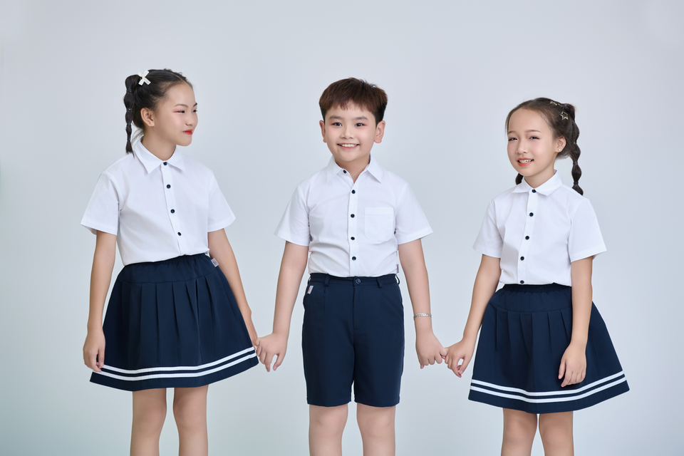 เสื้อนักเรียนแขนยาวสีดำติดกระดุม ผลิตจากผ้า TC ป๊อปลิน ทอแบบ FMF ผลิตในเวียดนาม สำหรับเด็กนักเรียนประถม ผสมโพลีเอสเตอร์ 65% และฝ้าย 35% แบบ unisex
