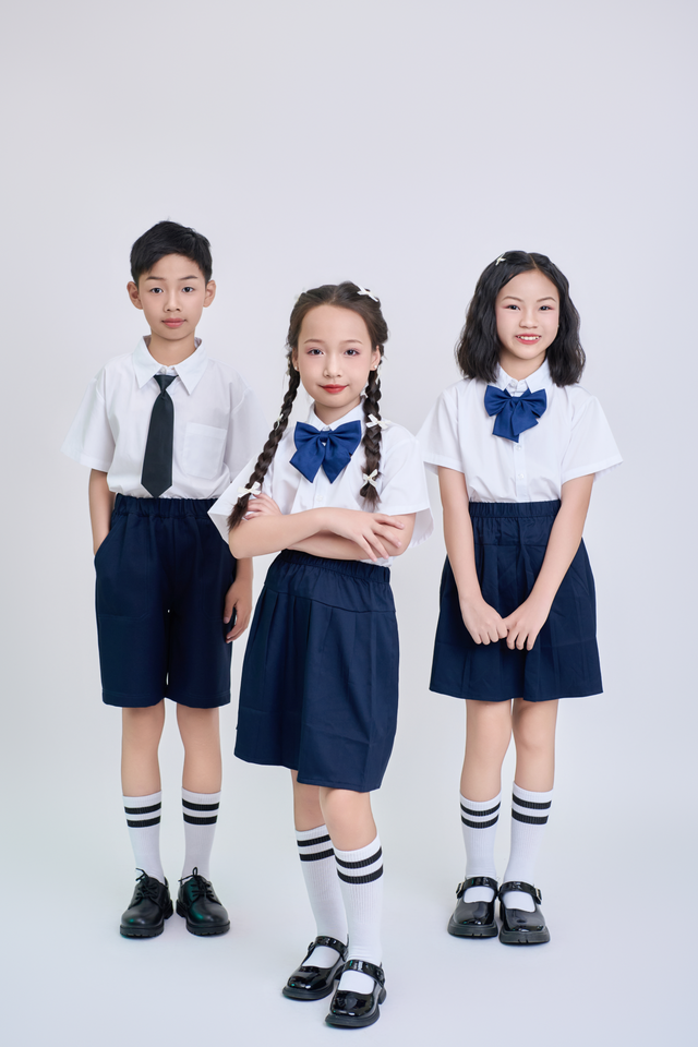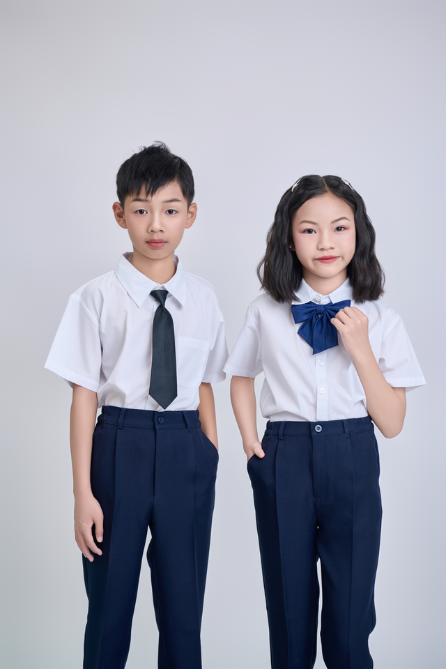 เสื้อเชิ้ตเด็กผู้ชาย/ผู้หญิง แขนสั้น สีขาว ผ้าป๊อปลินทอ ผลิตในเวียดนาม ยี่ห้อ FMF ผสมโพลีเอสเตอร์ 65% ผ้าฝ้าย 35% (กระดุมสีขาว)