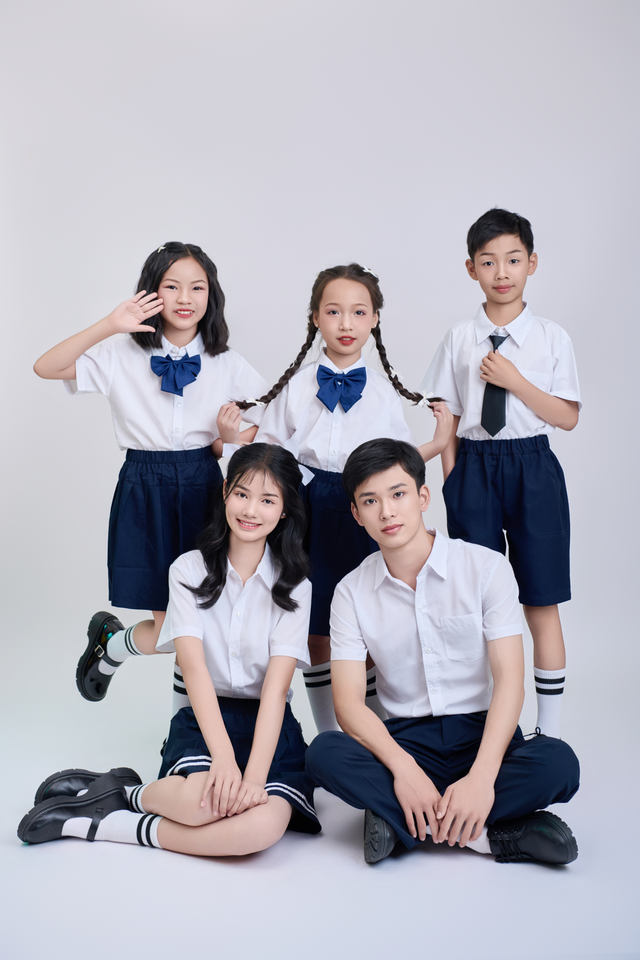 เสื้อเชิ้ตแขนสั้นสีขาวสำหรับนักเรียนชายหญิง ผ้าป๊อปลินทอ ผลิตในเวียดนาม ยี่ห้อ FMF ผสมโพลีเอสเตอร์ 65% ผ้าฝ้าย 35% กระดุมติด เหมาะสำหรับชุดนักเรียนประถม