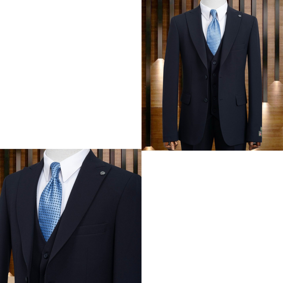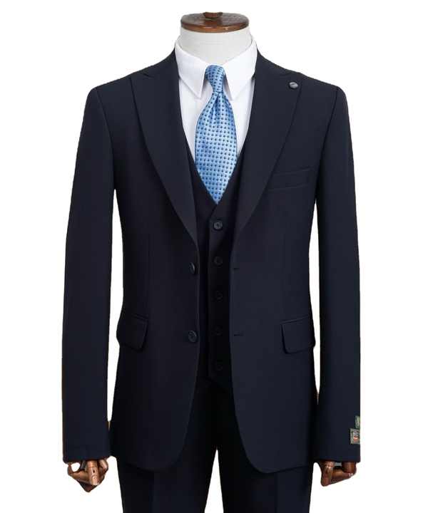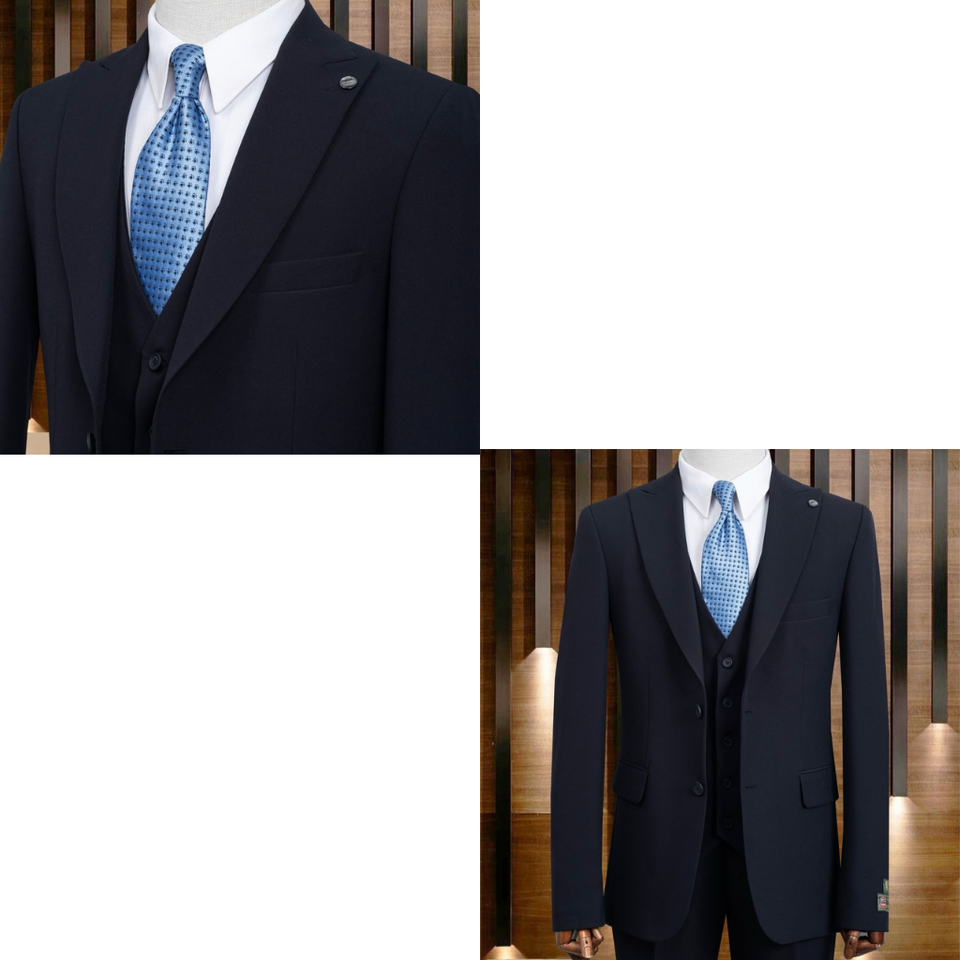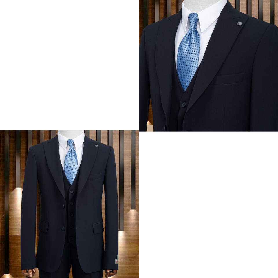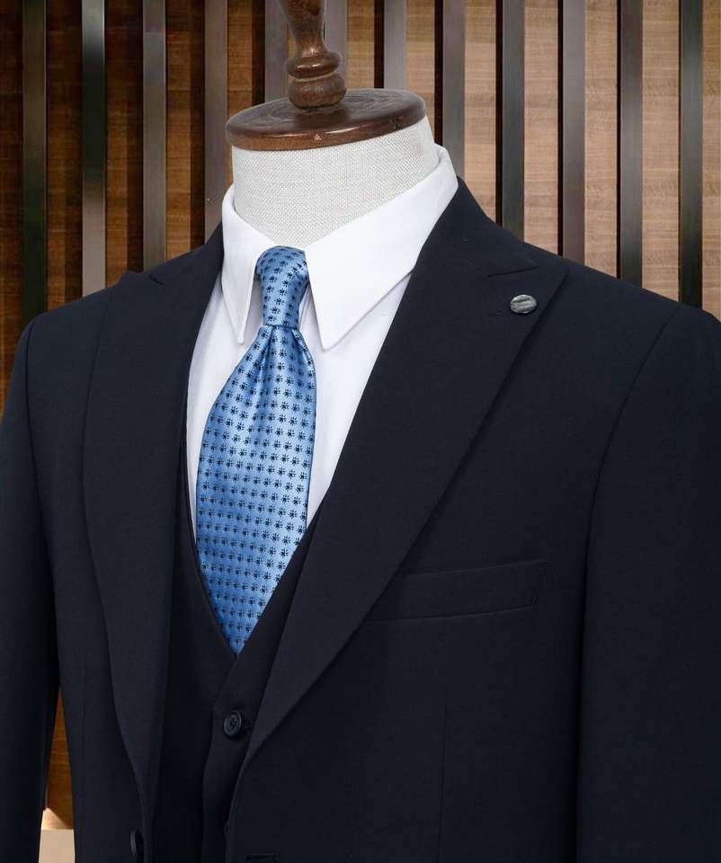 ชุดสูทผู้ชายสีกรมท่าสไตล์อิตาลี ผ้าโพลีเอสเตอร์ 65% วิสโคส 35% ระบายอากาศได้ดี พร้อมเสื้อกั๊ก ทรงเข้ารูปทันสมัย เหมาะสำหรับงานแต่งงาน ธุรกิจ และงานพิธีการ