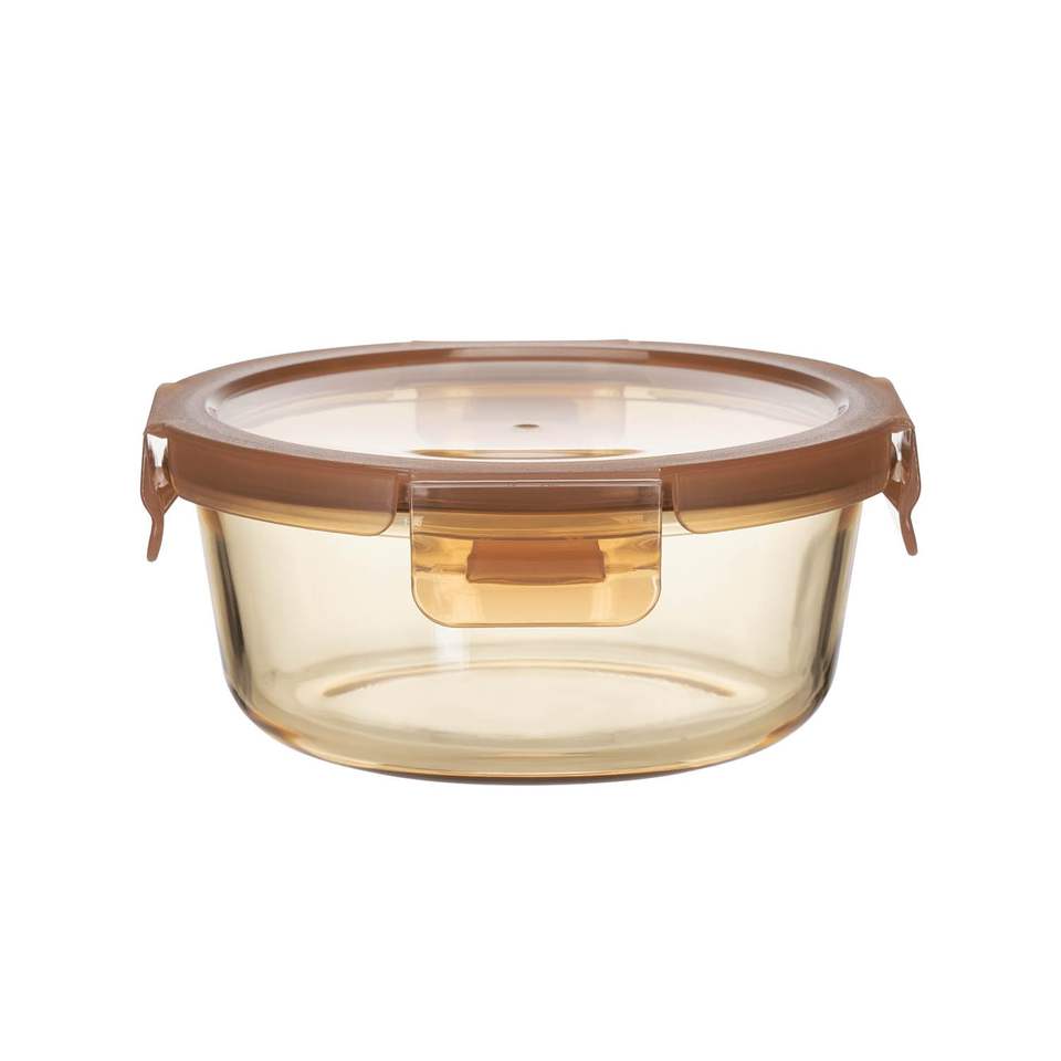 ภาชนะแก้วทรงกลมขนาด 650 มล. พร้อมฝา PP สีเหลืองอำพัน ใช้กับไมโครเวฟและเครื่องล้างจานได้