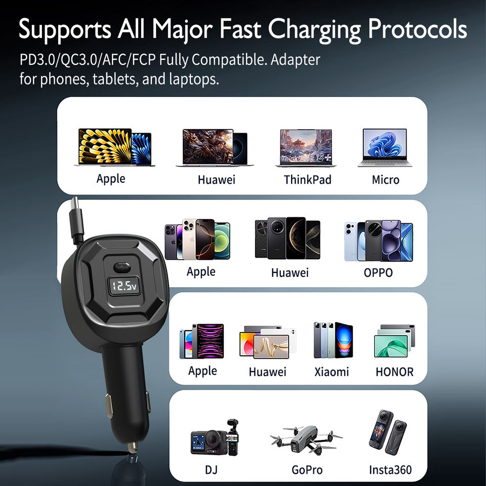 ที่ชาร์จเร็ว 65W แบบพับเก็บได้สำหรับรถยนต์ ที่ชาร์จโทรศัพท์ในรถยนต์ อะแดปเตอร์ที่จุดบุหรี่ ชนิด Type C 12-24V สำหรับ iPhone และ Android
