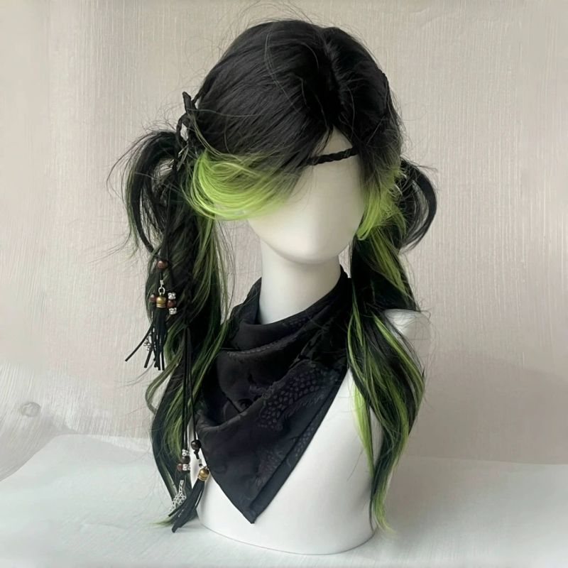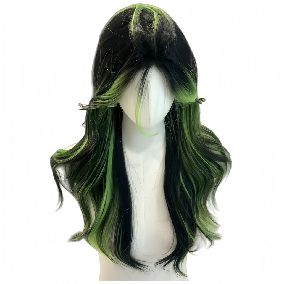 วิกผมยาวลอนคลื่นสีดำและเขียวไฮไลท์