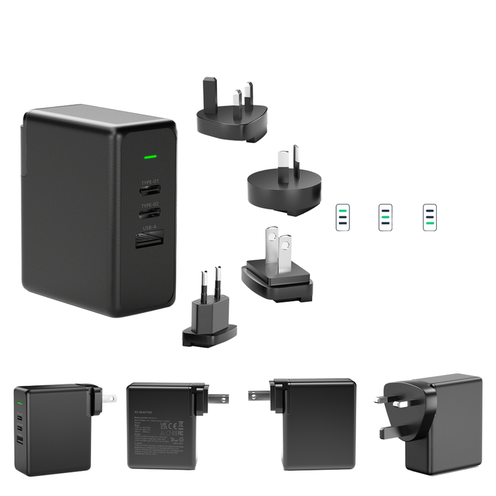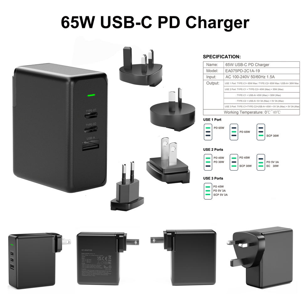 อะแดปเตอร์ชาร์จแล็ปท็อปและโทรศัพท์มือถือ 65W Type-C พร้อมปลั๊ก EU/US/UK/AU รองรับ QC3.0/PD ชาร์จเร็ว ใช้ได้กับหูฟัง
