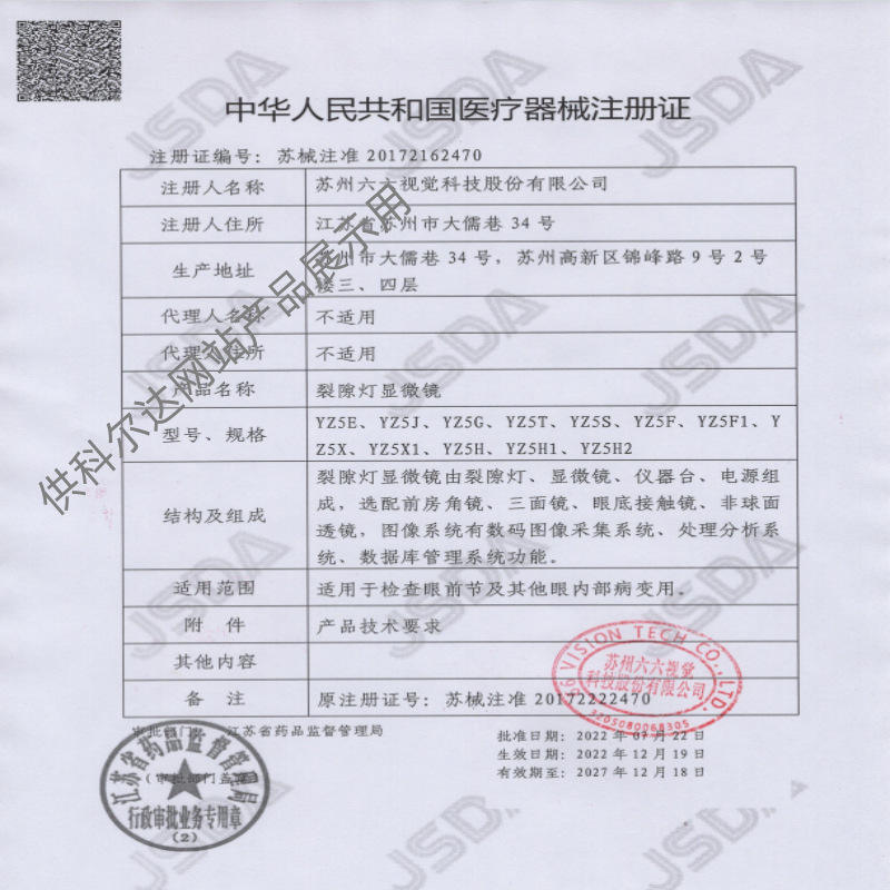 ใบรับรองการขึ้นทะเบียนเครื่องมือแพทย์มณฑลเจียงซู 20172162470