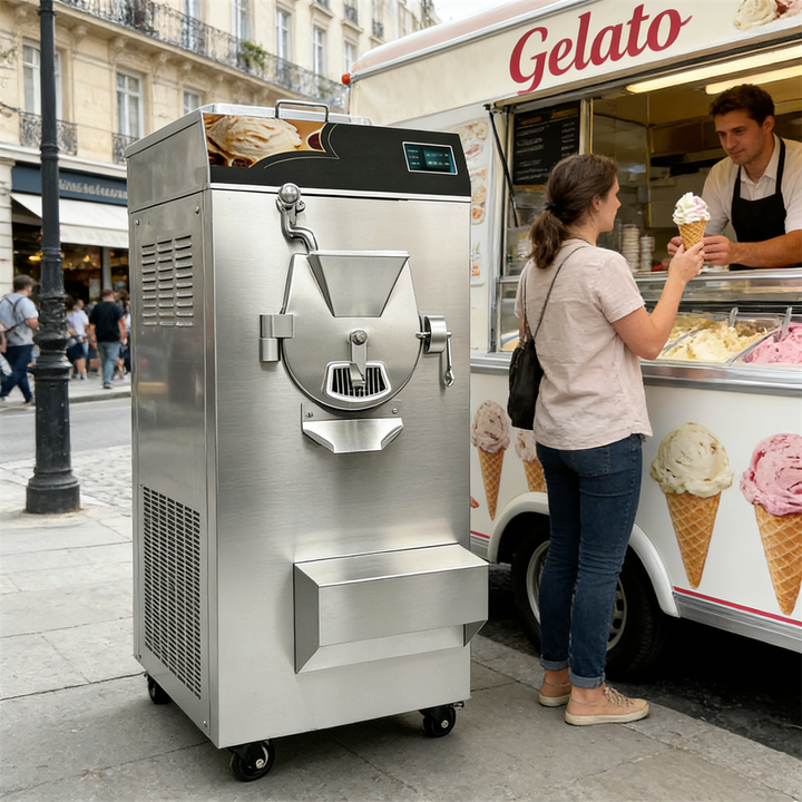 เครื่องทำไอศกรีม 68 ลิตร/ชั่วโมง พร้อมคอมเพรสเซอร์ในตัว - เครื่องทำไอศกรีมแบบแบทช์ฟรีซเซอร์ระดับมืออาชีพสำหรับธุรกิจ พร้อมเครื่องทำเจลาโต้แบบแข็ง