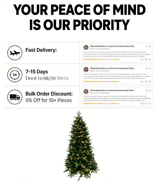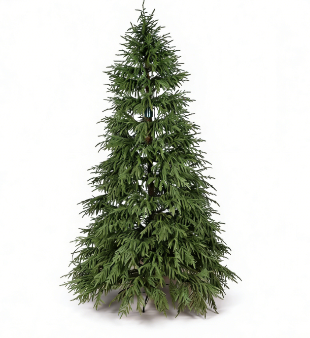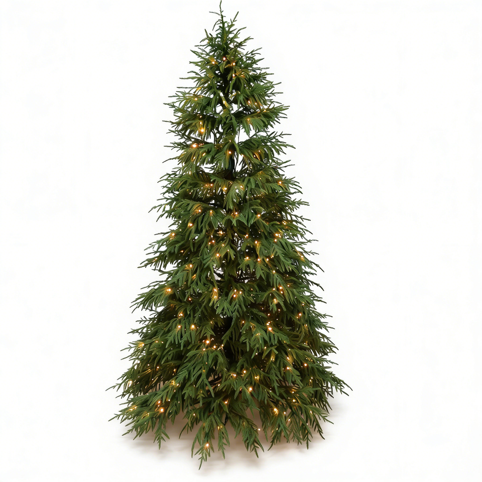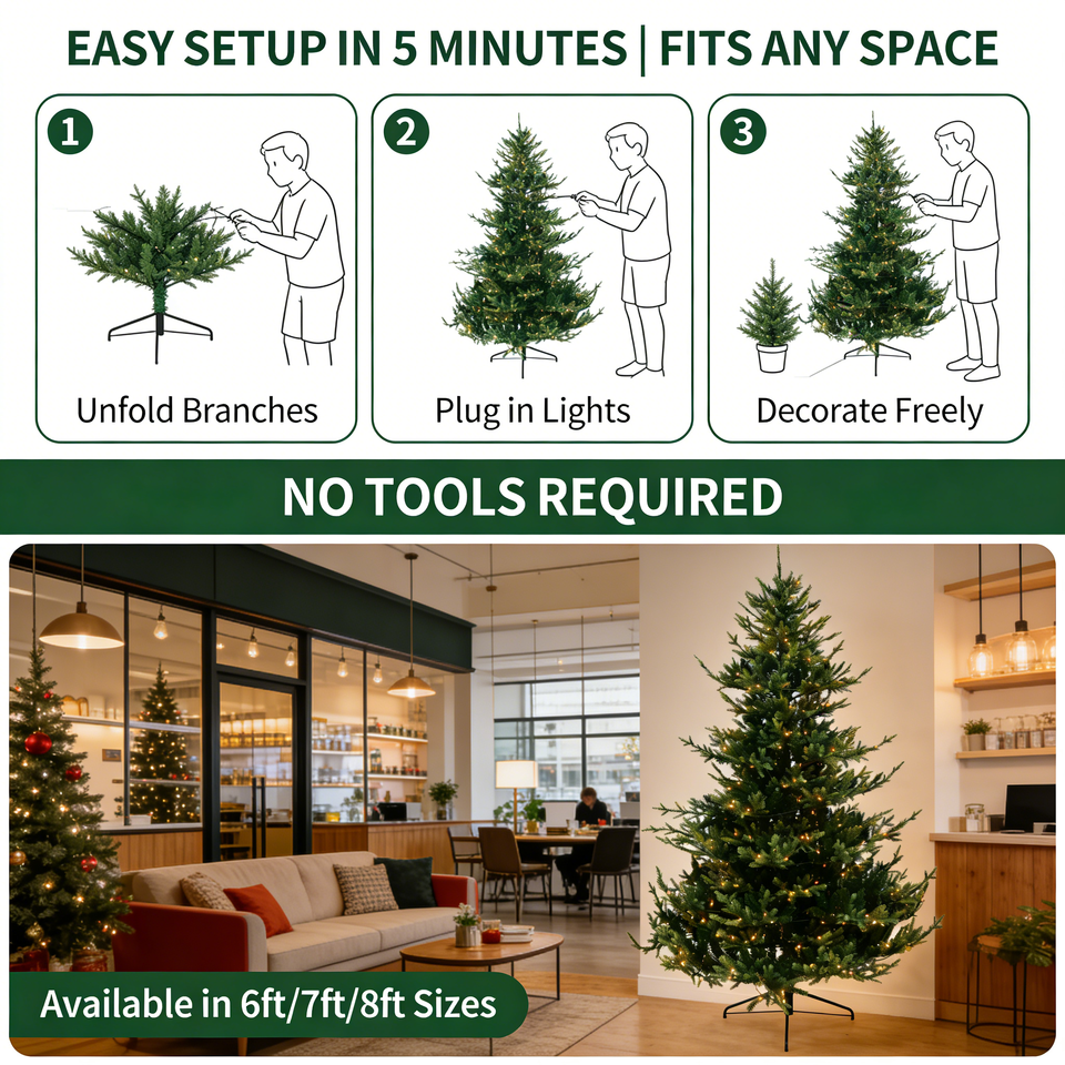 ต้นคริสต์มาสประดิษฐ์ขนาด 6 ฟุต/7 ฟุต/8 ฟุต แบบเหมือนจริง กิ่งก้านเต็ม ประดับด้วยเข็ม PE พร้อมไฟ LED | ของตกแต่งวันหยุดในร่มระดับพรีเมียม