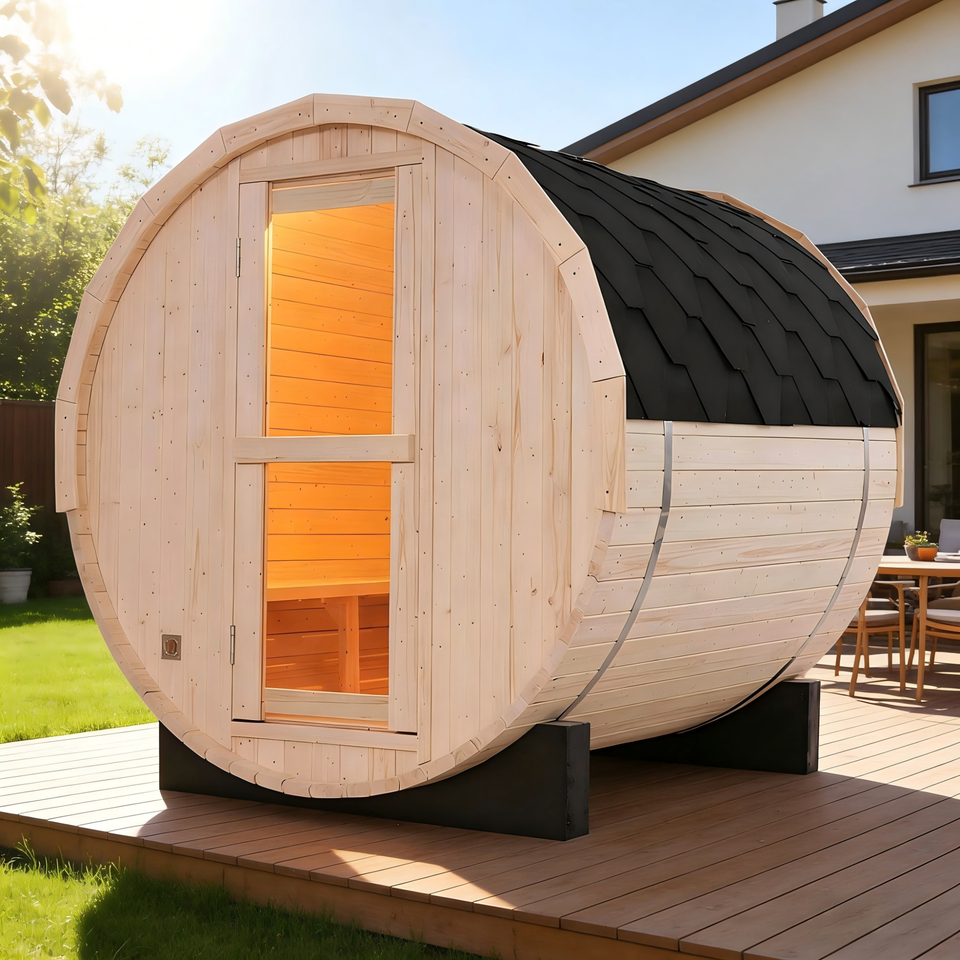 เครื่องทำความร้อน 6 กิโลวัตต์ สำหรับห้องซาวน่า 4 คน – ดีไซน์ทรงกระบอกไม้สนขาว พร้อมหลังคาป้องกันฝน