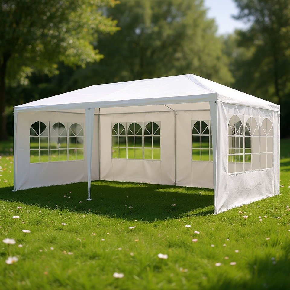 เต็นท์งานแต่งงานทรงศาลา ขนาด 6ม. x 3ม. พร้อมผนัง 6 ด้าน โครงอะลูมิเนียมอัลลอยด์ ผ้าโพลีเอสเตอร์ สำหรับใช้งานกลางแจ้งในฤดูร้อน