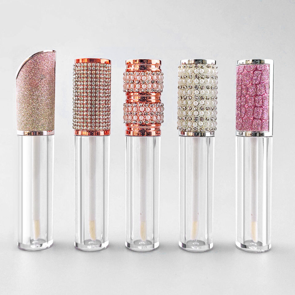 หลอดลิปกลอสพลาสติกเปล่าขนาด 6 มล. พร้อมกล่องและฉลากสั่งทำพิเศษ บรรจุภัณฑ์เครื่องสำอางหรูหราสีขาวมุก ฝาเกลียวทรงกลมสีตามสั่ง