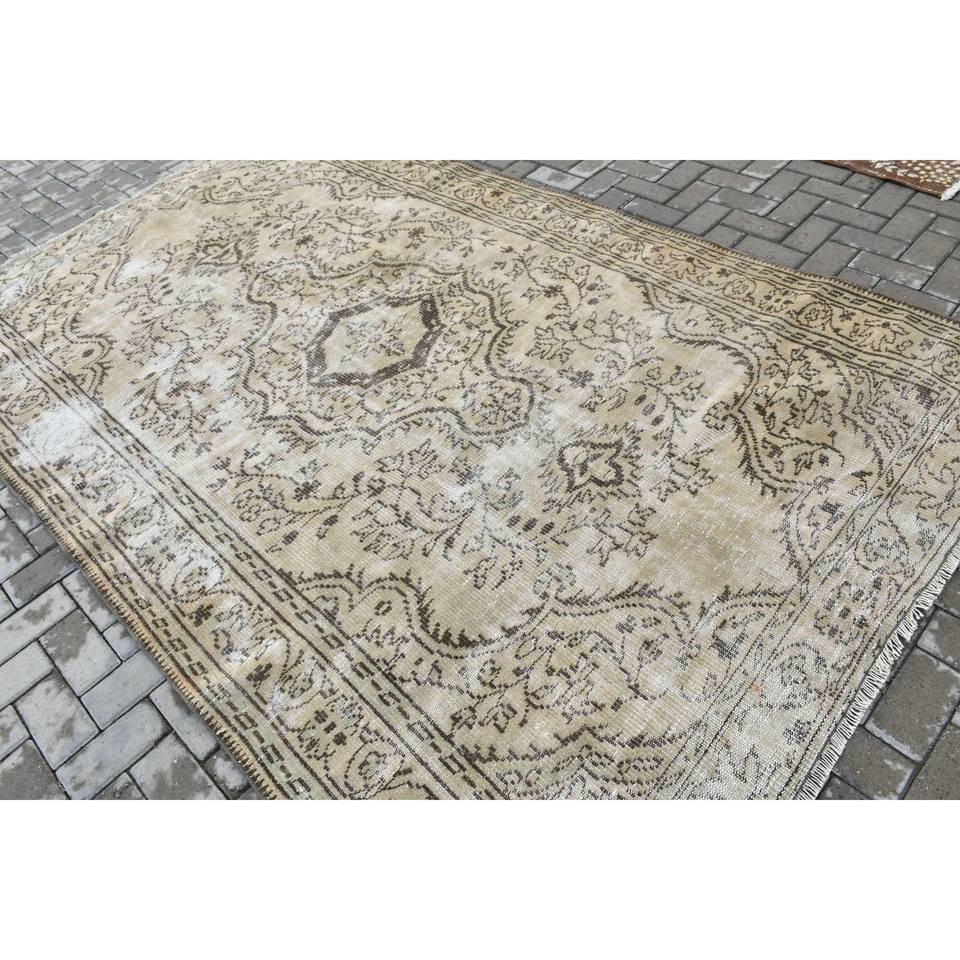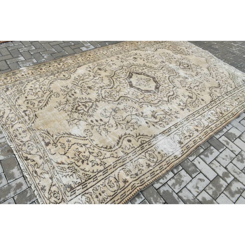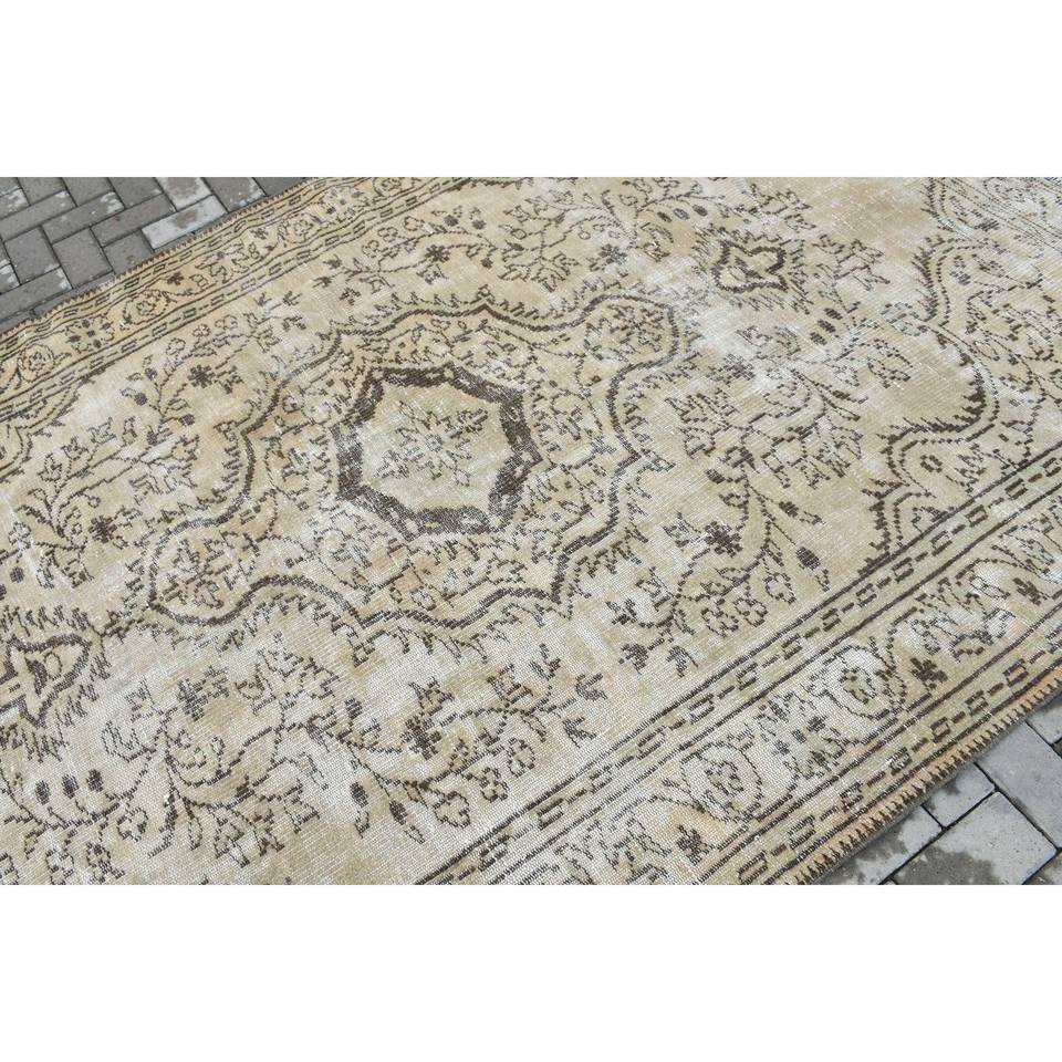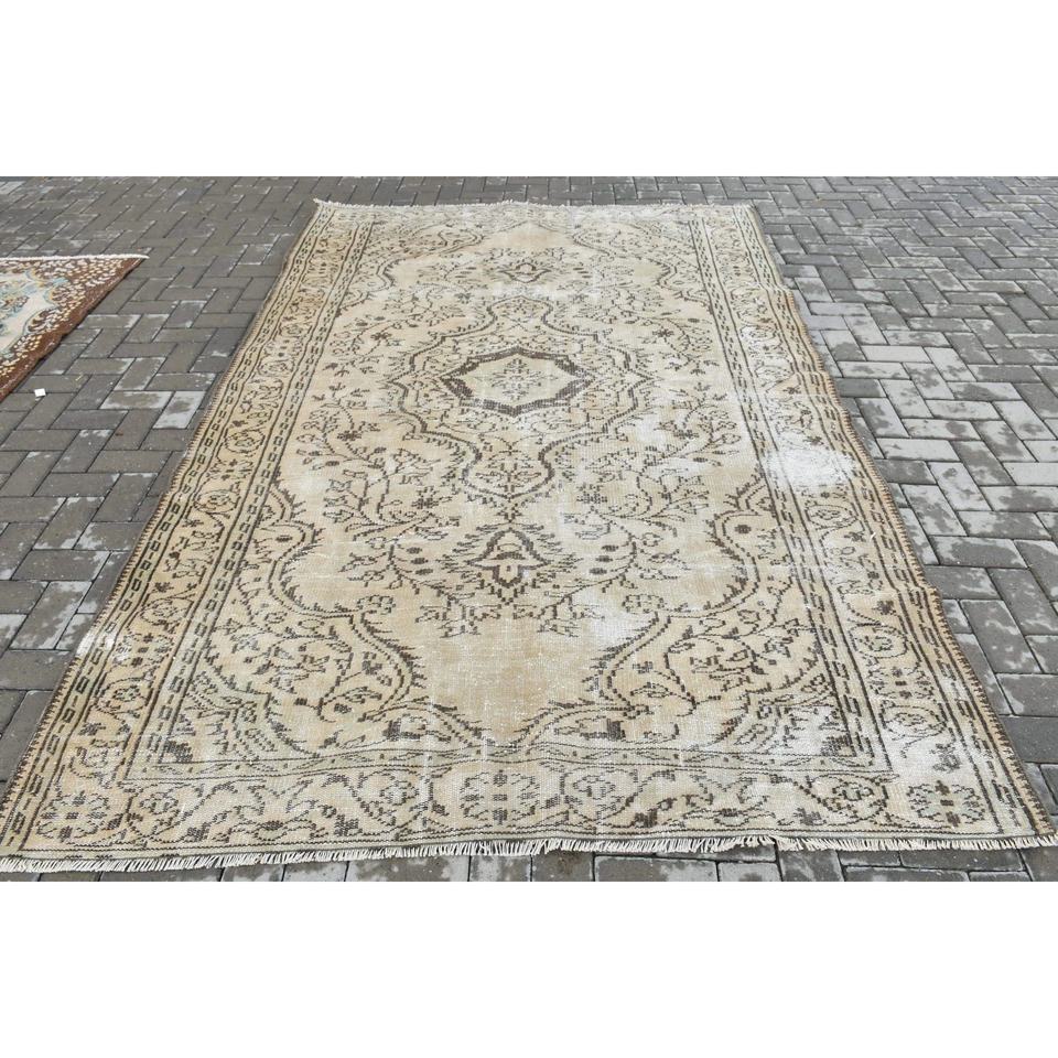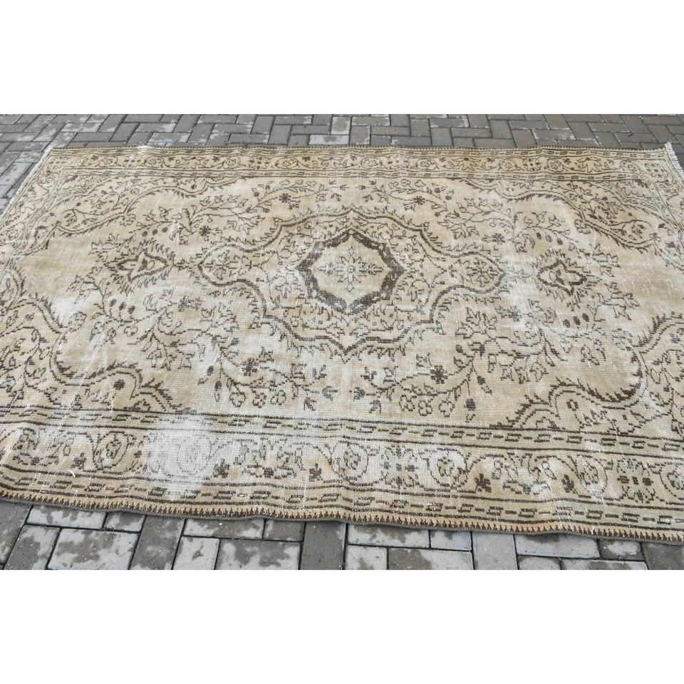 พรมตุรกีขนาด 6x9.5 ฟุต สีน้ำตาลลายทาง พรมขนสัตว์วินเทจ
