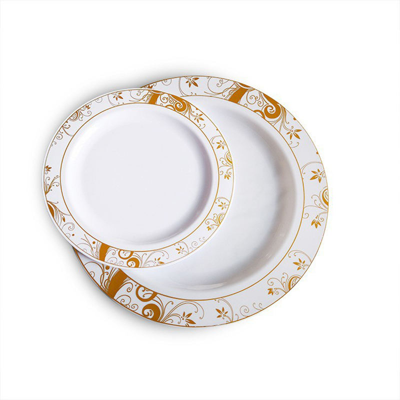 ชุดจานอาหารค่ำลายลูกไม้สีทองแบบใช้แล้วทิ้งขนาด7.5/10.25นิ้วถาดสีโรสโกลด์สำหรับบ้านหรืองานปาร์ตี้ดีไซน์จานกลม