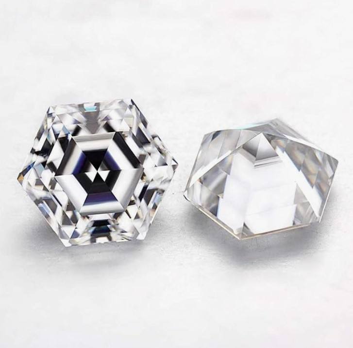 พลอยมอยส์ซาไนต์ทรงหกเหลี่ยมขนาด 7.5 มม. เจียระไนเหลี่ยมเพชร ประกายระยิบระยับ แทนเพชรที่เพาะเลี้ยงในห้องปฏิบัติการ น้ำหนัก 1.8 กะรัต พร้อมใบรับรองคุณภาพความเจียระไนระดับพิเศษ