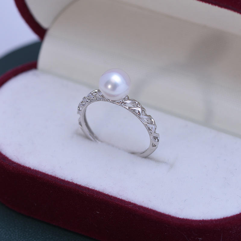 แหวนไข่มุกน้ำจืดสีขาวขนาด 7-8 มม. ทรงหลอดไฟ แสงสว่าง แข็งแรง แทบไร้ตำหนิ พร้อมตัวแหวนเงินแท้ S925 ลายเถาวัลย์